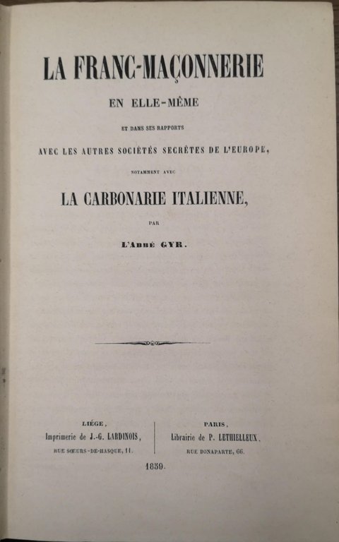LA FRANC-MAÇONNERIE EN ELLE-MÊME ET DANS SES RAPPORTS AVEC LES AUTRES SOCIÉTÉS SECRÈTES DE L'EUROPE, NOTAMMENT AVEC LA CARBONARIE ITALIENNE.