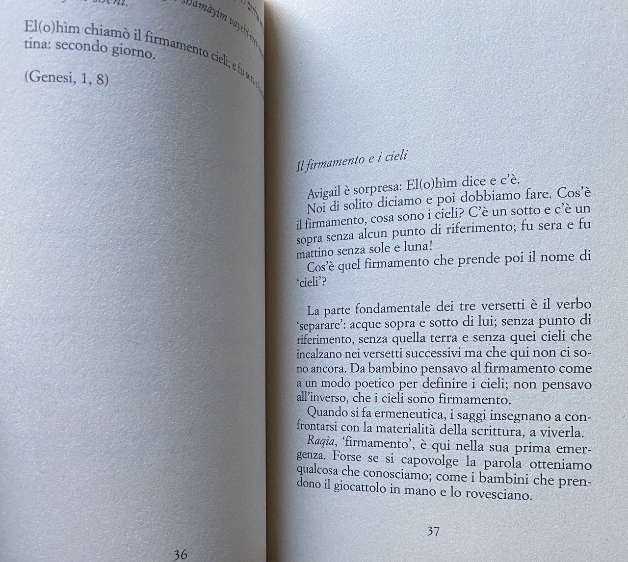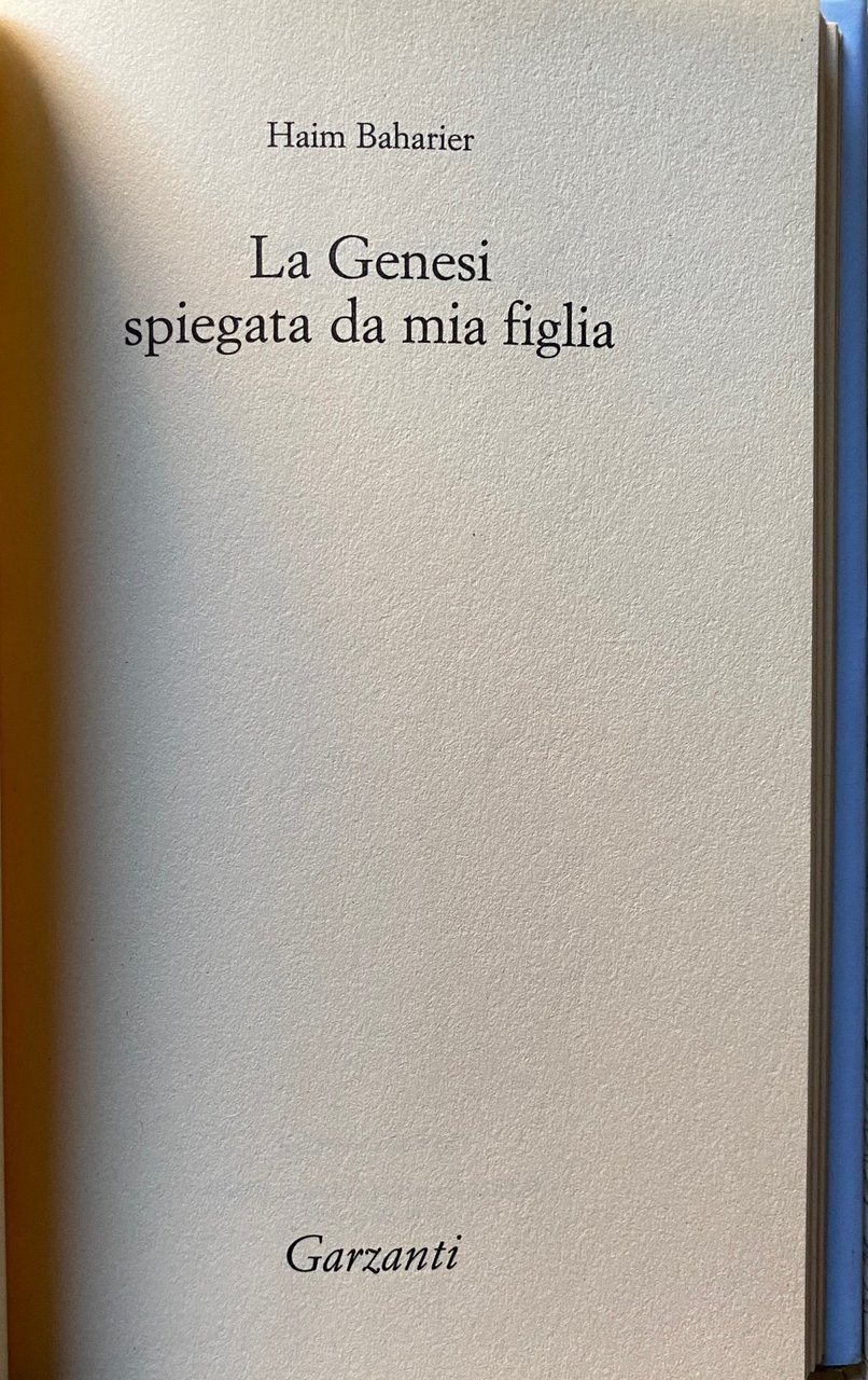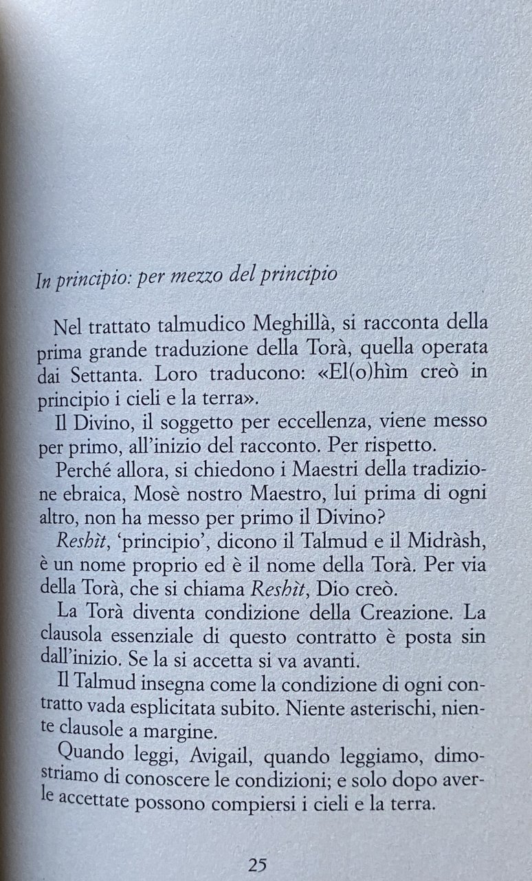 Secondo una leggenda midrashica, un angelo insegna tutta la Torah alla creatura che attende di nascere. Poi, al momento del parto, l'angelo sfiora con un dito il bambino, tra la base del naso e la bocca, e cancella tutto il suo sapere. Il bambino nasce puro e ignaro, recando però il segno di quel tocco: il leggero solco in mezzo al labbro superiore, il cosiddetto filtro. La rimozione della sapienza prenatale è un invito, rivolto in primo luogo ai genitori, a recuperarne la memoria attraverso lo studio. L'apprendimento della Torà è del resto per gli ebrei un precetto fondamentale ma anche un rimedio al male, alle intermittenze della vita, proprio come la preghiera è talora un rimedio alla sventura. Nessuno è escluso perché tutti, già una volta, abbiamo saputo. Da sempre Haim Baharier si confronta con le parole che innumerevoli occhi hanno percorso e studiato, attraversa e dilata lo scarno testo biblico con acuminate interpretazioni, dispensando generosamente sapienza ebraica e umana saggezza; le sue lezioni sono corroboranti, dalle sue parole si sprigiona una specie singolare di serenità. In questo breve, stupendo viaggio attraverso i versetti della Genesi, Baharier condensa la sua sapienza nella duplice, indispensabile veste di esegeta e padre. Lo fa per spiegare a sua figlia Avigail, e attraverso lei a noi, quali sono le motivazioni e le finalità della Torà e dare provvisoriamente eco al verbo, per permettere che penetri în noi, affinché l'uomo non vada in esilio all'interno di sé stesso.