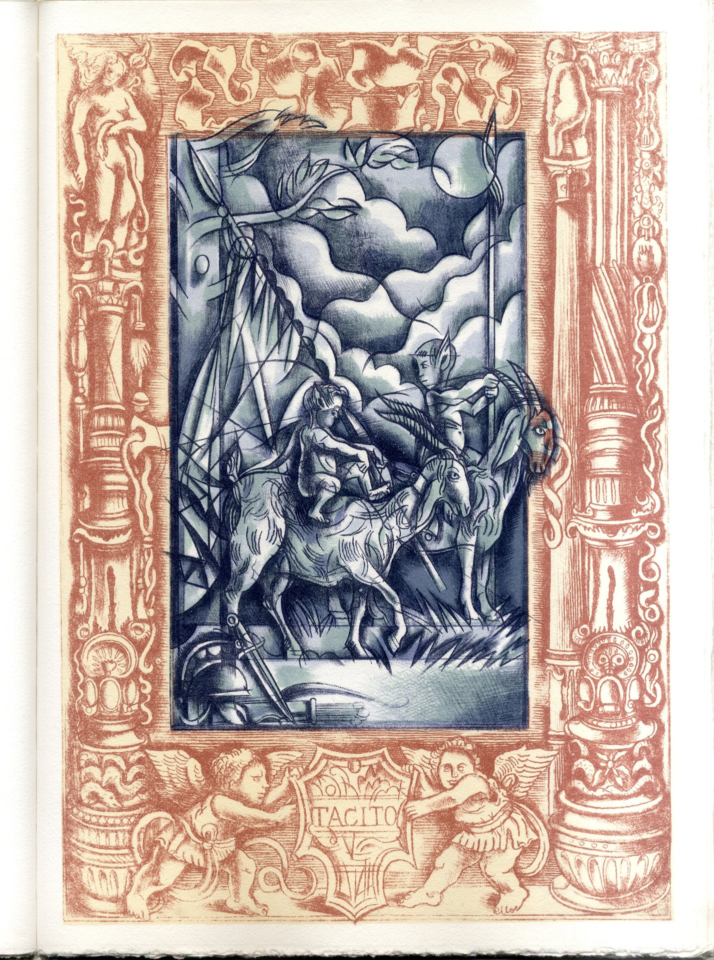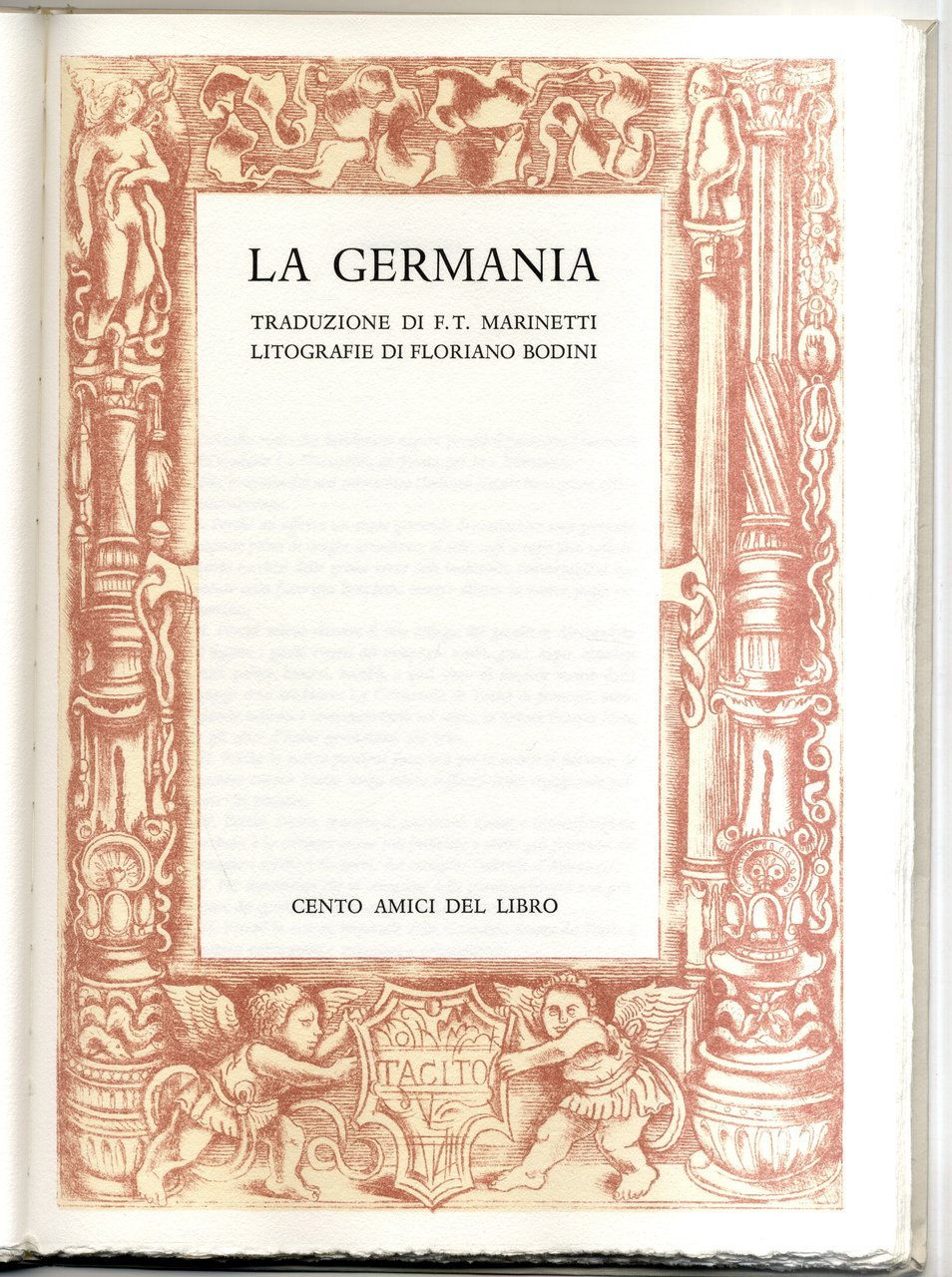 >in-4, pp. 54; leg. cart. e astuccio. Traduzione di F.T. Marinetti, proposta per questa tiratura da Andrea Marini, accompagata dal testo latino tratto da: Cornelii Taciti, opera minora. Oxonii e Typographeo Clarendoniano. Carattere Dante impresso a torchio da Alessandro Zanella su carta Alcantara. Litografie di Floriano Bodini, tirate a Milano da Giorgio Upiglio, l'artista ha firmato a lapis tutti i colophon. Tiratura di 130 esempl., uno dei 100 ad personam. Cfr. Parmiggiani. Parole figurate: "La Germania di Tacito fornisce l'occasione a Floriano Bodini di dare vita a un libro complesso, splendido nelle decorazioni ai margini delle pagine". Magnifico esemplare.