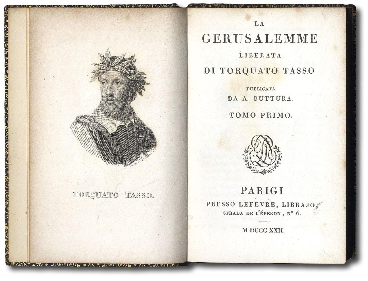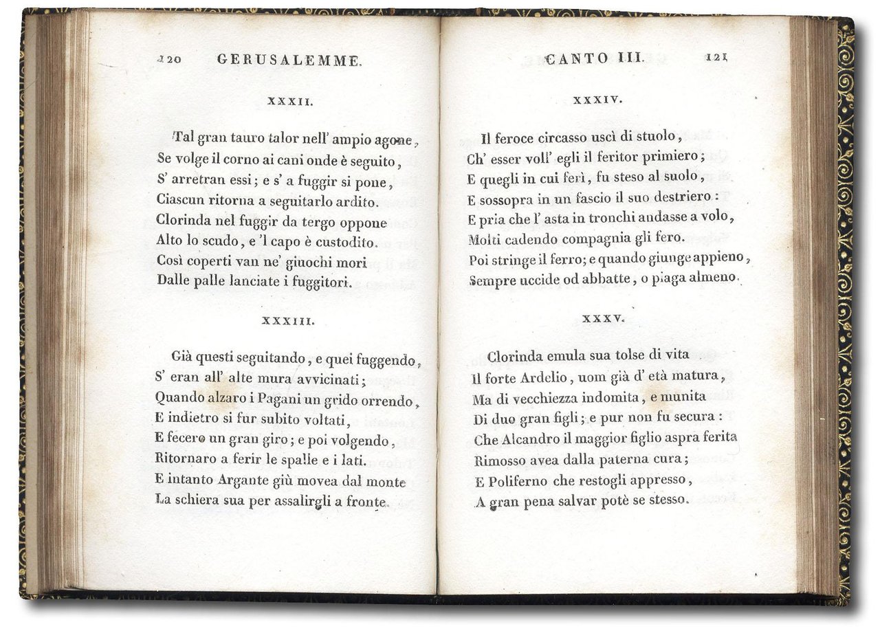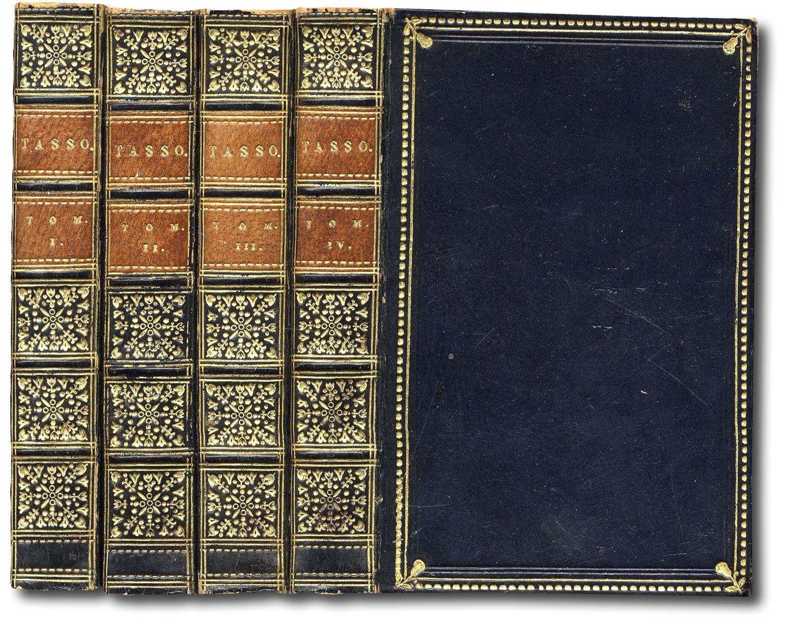 >4 volumi in-32 (mm 100x65), pp. 240 con ritratto dell'A. in antiporta; 256; 256; 255. Belle legature uniformi in marocchino blu, duplice filetto a secco e cornice oro con raffinate terminazioni angolari a forma di piccole pere, dorsi con duplice tassello e decorazioni ai piccoli ferri in oro al dorso. Pregiata edizione facente parte della biblioteca poetica italiana scelta, raccolta letteraria diretta da Antonio Buttura (1770-1832) annunciata in 30 volumi e suddivisa in prima, seconda e terza età della poesia italiana. Il Buttura, poiché favorevole agli occupanti francesi, fu costretto, dopo la rivincita austriaca del 1799, a rifugiarsi in Francia, dove diventò figura centrale della comunità italiana a Parigi, nonché l'artefice di una sfida editoriale resa possibile dal sostegno di Didot: la pubblicazione di una collana di classici che avrebbe rappresentato una vera e propria innovazione per il mercato francese del primo trentennio dell'Ottocento. Ottimo esemplare. Bondy, Miniature books, p.91.