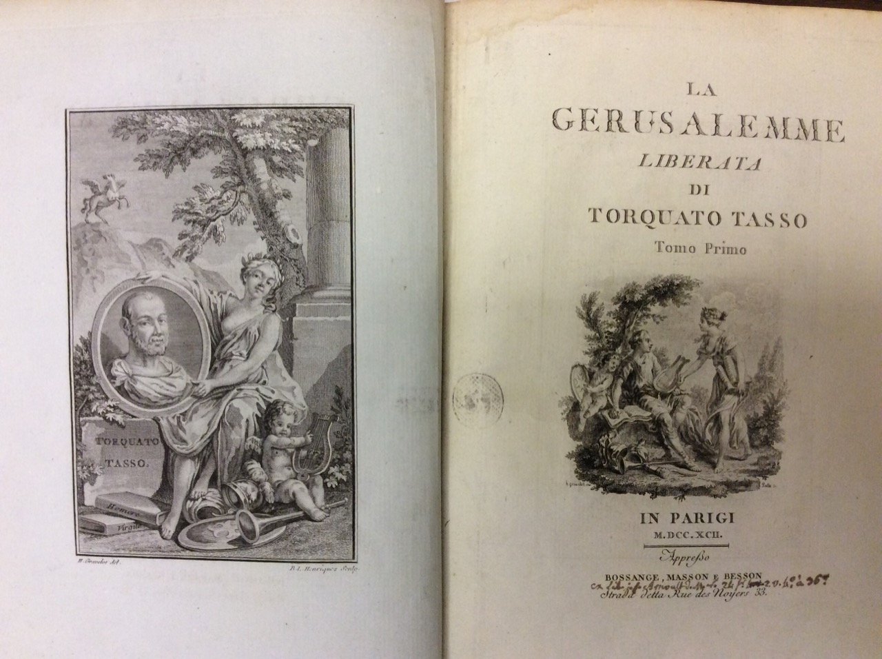 In-8 gr. (mm. 260 x 194), 2 volumi, elegante legatura in p. pelle coeva, sottile cornice a secco ai piatti, dorso a cordoni con fregi e titolo oro su tassello, pp. (4),VIII,326; (4),333,(3); bella vignetta incisa sui due frontespizi e con due antiporte allegoriche che racchiudono due ritratti in medaglione: uno del Tasso e l'altro di Hubert Gravelot, l'illustratore del poema.Magnifica edizione della "Gerusalemme Liberata" su carta distinta, e con le illustrazioni incise per lo più su carta azzurrina, così composte: 20 tavole all'inizio dei 20 canti con, a fronte, 20 tavole con solo grandi testate che raffigurano le medaglie degli eroi del Poema, oltre a 27 culs-de-lampes (a mezza e talvolta a piena pagina) magistralmente realizzate, ed incise in rame da diversi artisti (tra cui Henriquez, Le Roy, Rousseau, Duclos).Le stesse tavole che ornano la presente edizione furono utilizzate nella famosa edizione del 1771, stampata anch'essa a Parigi ma presso Delalain, Durand e Molini. Gli splendidi disegni si devono a Hubert Gravelot (pseudonimo di Hubert-François Bourguignon d'Anville, 1699-1773), celebre pittore e caricaturista francese; lavorò a lungo in Inghilterra e, una volta rientrato a Parigi, divenne un importante illustratore di libri del tempo; tra le sue opere più famose si annoverano le tavole del Decamerone, del Théatre de Pierre Corneille, delle Métamorfose e della già citata edizione della "Gerusalemme" del 1771.Cfr. Raccolta Tassiana della Biblioteca Mai di Bergamo, 307 e 277 - Lewine, p. 525 e Boissais / Deleplanque, p. 167 per l'ediz. del 1771 - Benezit,VI, p. 393.Nei margini del testo si rilevano dottissime ed eleganti glosse in scrittura calligrafica con citazioni in greco e latino, dell'Eneide e delle Georgiche, della Farsalia, delle Argonautiche e dell'Iliade.Solo una carta con lieve macchia marginale, altrimenti bell'esemplare, ben conservato.