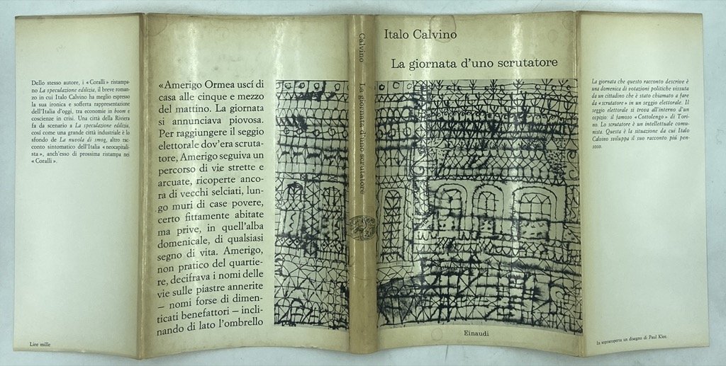 Tela editoriale con sovraccoperta illustrata, cm 19.5 x 12.5, pp 97 (3). Collana Coralli, Numero 175. Esemplare con segni del tempo, sovraccoperta con piccole gore e brunita sul dorso (da casa di fumatore). Edizione originale di questo romanzo scritto tra il 1953 e il 1963; sovraccoperta on illustrazione da Paul Klee e nota dell'autore sui risvolti. Gambetti Vezzosi, p. 154; Spaducci, p. 69.