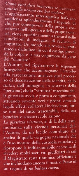 Come puoi dirti innocente se nemmeno conosci la norma che hai violato? L'agghiacciante interrogativo kafkiano condensa splendidamente l'angoscia di chi, pur consapevole della propria correttezza nell'operare e della propria onestà, viene repentinamente a trovarsi nelle condizioni di indagato, di recluso, di imputato. Un mondo alla rovescia, grottesco e diabolico, in cui il castigo precede la colpa e la sua cognizione da parte del dannato. L'Autore, nel ripercorrere le sequenze liturgiche che accompagnano l'introibo alla carcerazione, analizza quel processo di decostruzione della identità, dello status, dell'immagine, in sostanza della persona, che la virtuosa macchina della giustizia avvia e porta a compimento, attuando sovente veri e propri omicidi legali: effetti collaterali indesiderati, forse non del tutto trascurabili, della sua benefica e soccorrevole azione. La giustizia virtuosa, al di là della testimonianza sulla vicenda personale dell'Autore, dà un lucido contributo all'analisi di quella vergogna nazionale che è l'uso incauto della custodia cautelare e ripropone la indilazionabile necessità di rivedere molti sacri riti giudiziari di cui il Magistrato resta tirannico officiante e che inchiodano ancora il nostro Paese in un regime di ne Habeas Corpus.