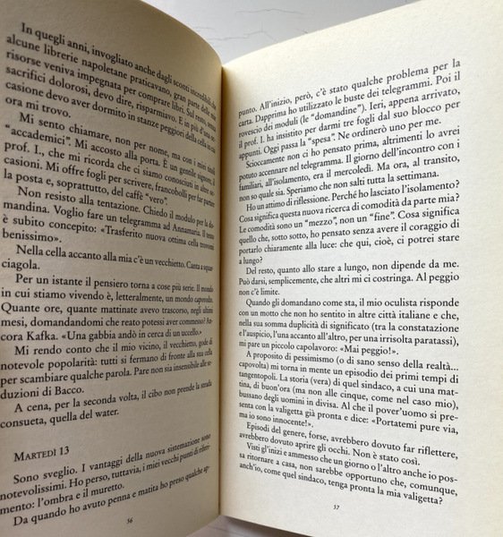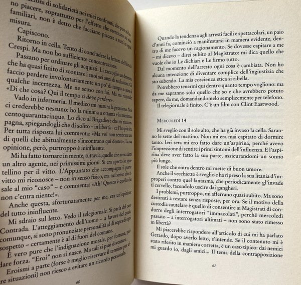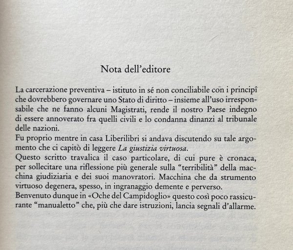 Soggetti: Detenzione, Diritto penale, Scienze sociali, Pene e punizione, Politica, Società, Servizi sociali, Criminologia, Procedura civile, Etica della responsabilità, Fenomenologia dello spirito, Husserl, Heidegger, Hegel, Innocenza, Colpa, Filosofia, Vicende personali, Esperienze carcerarie, Carcerazione preventiva, Difesa, Presunzione, Repressione, Libertà, Diritti umani, Noberto Bobbio, Biografie, Memorie, Diario, Detenuti, Weber, Terrore, Coscienza virtuosa, Processi politici, Abuso d'ufficio, Accuse, Giustizia, Magistratura, Custodia cautelare, Norme, Giurisprudenza, Cesare Beccaria, Manzoni, Pagano, Giudici, Costituzione, Montesquieu, Filangieri, Verri, Stato di diritto, Storie vere, Cronache, Libri Vintage Fuori catalogo, Riflessioni, Macrobio, Kant, Professori, Accademici, Intellettuali, Detention, Criminal law, Social sciences, Penalties and punishment, Politics, Society, Social services, Criminology, Civil procedure, Ethics of responsibility, Phenomenology of the spirit, Innocence, Guilt, Philosophy, Personal affairs, Prison experiences, Pre-trial detention, Defense, Presumption, Repression, Freedom, Human rights, Biographies, Memories, Diary, Detainees, Terror, Virtuous conscience, Political trials, Abuse of office, Accusations, Justice, Judiciary, Pre-trial detention, Norms, Jurisprudence, Judges, Constitution, Rule of law, True stories, Chronicles, Out of print books, Reflections, Macrobius, Professors, Academics, Intellectuals