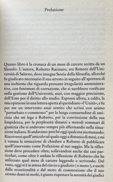 Il libro racconta i ventiquattro giorni che il professor Racinaro passa in carcere di cui sette in isolamento (nel 2012 dopo 15 anni la sentenza definitiva l'ha dichiarato innocente), con l'accusa di abuso d'ufficio e corruzione. Durante questi quindici anni ha rifiutato la prescrizione, scegliendo di percorrere tutti i gradi di giudizio certo di non aver commesso quei reati. Una scelta il cui costo è stato enorme e sostanziale (anche per la sua salute) per l'uomo e per la comunità.