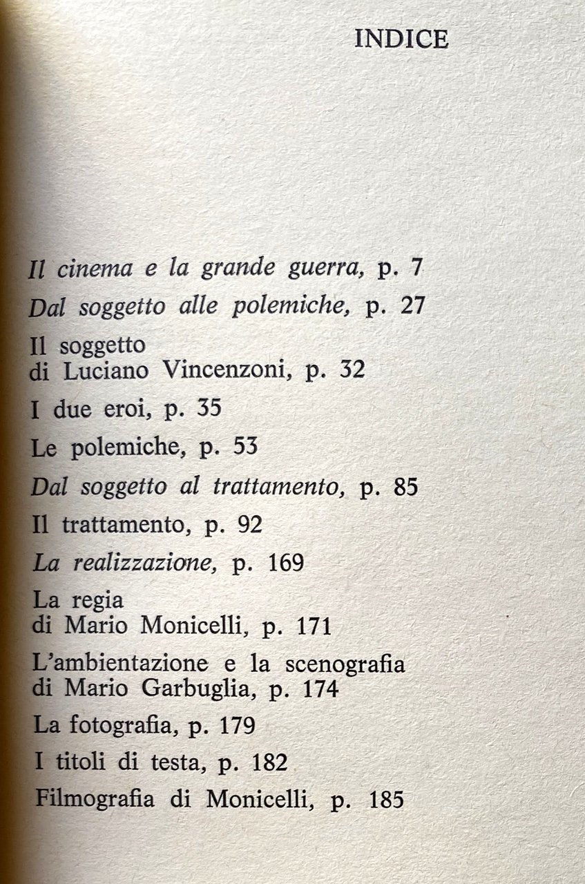 Soggetti: Cinema italiano, Registi italiani, Filmografia, Critica cinematografica, Film drammatici, Regia, Soggetto, Sceneggiature, Libri rari illustrati Vintage fuori catalogo, Collezionismo, Recensioni, Classici, Capolavori, Realismo, Bianco e nero, Attori, Amici Austriaci Battaglia Bordin Capitano Compagnia Costantina Eroi Fronte Fucilazione Giardino Giornali Giovanni Busacca Grande Prima guerra mondiale Jacovacci De Laurentiis Loquenzi Militare Morti Nazionale Oreste Paese Plotone Esecuzione Polemica Ponte Produttore Pubblico Ragazzi Realizzazione Memoria Scena Sergente Soggetto Soldati Storia Tenente Gallina Toni e Bepi Trincea Truppe Ufficiali Vittorio Alberto Sordi Vittorio Gassman Silvana Mangano Folco Lulli Bernard Blier Romolo Valli Vittorio Sanipoli Nicola Arigliano Geronimo Meynier Mario Valdemarin Elsa Vazzoler Tiberio Murgia Livio Lorenzon Ferruccio Amendola Carlo D'Angelo Achille Compagnoni Luigi Fainelli Marcello Giorda Tiberio Mitri Gérard Herter Guido Celano Gianni Baghino Mario Colli Mario Feliciani Mario Frera Mario Mazza Gian Luigi Polidoro Leandro Punturi Mostra Venezia Nastro d'argento Oscar Anni Cinquanta Commedia amara all'italiana Commedie Neorealismo Piano sequenza finale Corale Fascismo Censura Ricostruzione bellica Battaglie Piave Disfatta Sconfitta Caporetto Condizioni di vita Dialoghi Pellegrino Artusi Francesca Bertini Saluto italico Carducci I soliti ignoti Un anno sull'Altipiano Emilio Lussu Con me e con gli alpini Piero Jahier Carlo Salsa Fucilazione Friuli Musiche Nino Rota Polemiche Goffredo Lombardo Franco Cristaldi Elio Petri Maurizio Liverani Sergio Amidei Il generale Della Rovere Rossellini René Clair Luigi Chiarini Incassi Successi Botteghino Anni Sessanta Rotunno Oreste De Fornari Guido Aristarco Gian Luigi Rondi Esercito Patriottismo Giuseppe Marotta Migliori costumi Danilo Donati Furio Scarpelli Più visti Tullio Kezich Mario Garbuglia Ambientazione Trattamento Documentario Archivio Istituto LUCE RAI Rolando Renzoni Austria Aldo Valori Ungaretti Bibliografia Riferimento Kolossal Cabiria Opinione pubblica Spettatori Pubblico Lewis Jacobs Pacifismo Militarismo Mercato Kubrick Orizzonti di Gloria Intesa Comando Supremo Filippo Sacchi Borgese Ansaldo Eroismo Nemici Vittorio Veneto Regno Savoia Giuseppe Amato Totò Titoli di coda Musica Colonna sonora Alpi Carso Set Ciak Retrovie Borghesia Provincialismo Romanzo popolare Brancaleone Italian cinema Italian directors Filmography Film criticism Drama films Direction Subject Screenplays Rare illustrated books out of print Collecting Reviews Classics Masterpieces Black and white Actors Austrian friends Battle Captain Company Constantine Heroes Front Shooting Garden Newspapers Great First World War Military Deaths National Country Platoon Execution Controversy Bridge Producer Audience Boys Realization Memory Scene Sergeant Subject Soldiers History Trench Troops Officers Exhibition Venice 1950s Award Bitter Italian Comedy Comedies Neorealism Final Sequence Plan Choral Fascism Censorship War Reconstruction Battles Defeat Living Conditions Dialogues The Usual Unknowns Plateau Shooting Music Controversy Box Office Successes Sixties Army Patriotism Best Costumes Most Viewed Setting Treatment Documentary Archive Bibliography Reference Public Opinion Spectators Audience Pacifism Militarism Market Horizons of Glory Agreement Supreme Command Heroism Enemies Kingdom of Savoy End Credits Music Soundtrack Alps Karst Behind the scenes Bourgeoisie Provincialism Novel popular