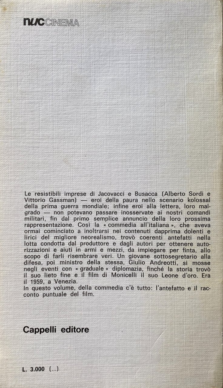 Le resistibili imprese di Jacovacci e Busacca (Alberto Sordi e Vittorio Gassman) eroi della paura nello scenario kolossal della prima guerra mondiale; infine eroi alla lettera, loro malgrado non potevano passare inosservate ai nostri comandi militari, fin dal primo semplice annuncio della loro prossima rappresentazione. Così la commedia all'italiana, che aveva ormai cominciato a inoltrarsi nei contenuti dapprima dolenti e lirici del migliore neorealismo, trovò coerenti antefatti nella lotta condotta dal produttore e dagli autori per ottenere autorizzazioni e aiuti in armi e mezzi, da impiegare per finta, allo scopo di farli risembrare veri. Un giovane sottosegretario alla difesa, poi ministro della stessa, Giulio Andreotti, si mosse negli eventi con graduale diplomazia, finché la storia trovò il suo lieto fine e il film di Monicelli il suo Leone d'oro. Era il 1959, a Venezia. In questo volume, della commedia c'è tutto: l'antefatto e il racconto puntuale del film.