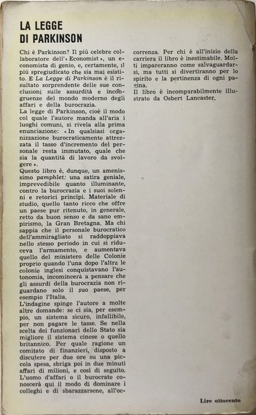 Soggetti: Saggistica, Libri Vintage, Fuori catalogo, Lavoro, Scritti umoristici, Risorse umane, Organizzare il tempo, Stupidità, Economia, Libri cult, Problemi, Difetti di funzionamento, Organizzazioni, John Murray, Classici, Rari, Management, Gestione, Tecniche, Scienza comportamentale, Attualità, Ironia, Pubblica amministrazione, Scienze sociali e pedagogiche, Psicologia, Burocrazia, Illustrazioni, Disegni, Humour, Ironia, Controllo sociale, Potere, Inefficienza, Cose che non funzionano, Meccanismi, Impresa, Strategia, Politica, Ministeri, Promozioni, Meritocrazia, Riforme, Satira, Pamphlet, Personale, Dirigenti, Direttori, Quadri, Burocrati, Impiegati, Inghilterra, Anni Cinquanta, Affari, Finanziamenti, Funzionamento, Apparati, Luoghi comuni, Retorica, Principi, Colonie inglesi, Tasse, Spese, Entrate, Uscite, Evasione fiscale, Poste, Finanza, Responsabilità, Iniziativa, Tempo libero, Spedire, Cartolina, Coefficiente di inefficienza, Tempo perso, Consigli, Sindacati, Diritto, Anzianità, Edilizia, Riunioni, Sprechi, Legge, Profitti, Out of print books, Work, Humorous writings, Human resources, Organizing time, Stupidity, Economy, Problems, Operating defects, Organizations, Classics, Techniques, Behavioral science, Current affairs, Irony, Public administration, Social and pedagogical sciences, Psychology, Bureaucracy, Illustrations, Drawings, Humor, Irony, Social Control, Power, Inefficiency, Things that do not work, Mechanisms, Business, Strategy, Politics, Ministries, Promotions, Meritocracy, Reforms, Satire, Personnel, Executives, Directors, Executives, Bureaucrats, Employees, England, Fifties, Financing, Operation, Common Places, Rhetoric, Princes, English colonies, Taxes, Expenses, Revenue, Expenses, Posts, Responsibility, Leisure, Shipping, Postcard, Lost time, Councils, Unions, Law, Seniority, Construction, Meetings, Waste, Law, Profits