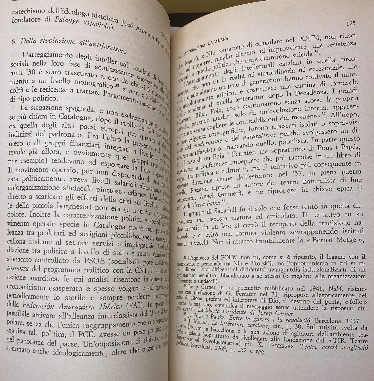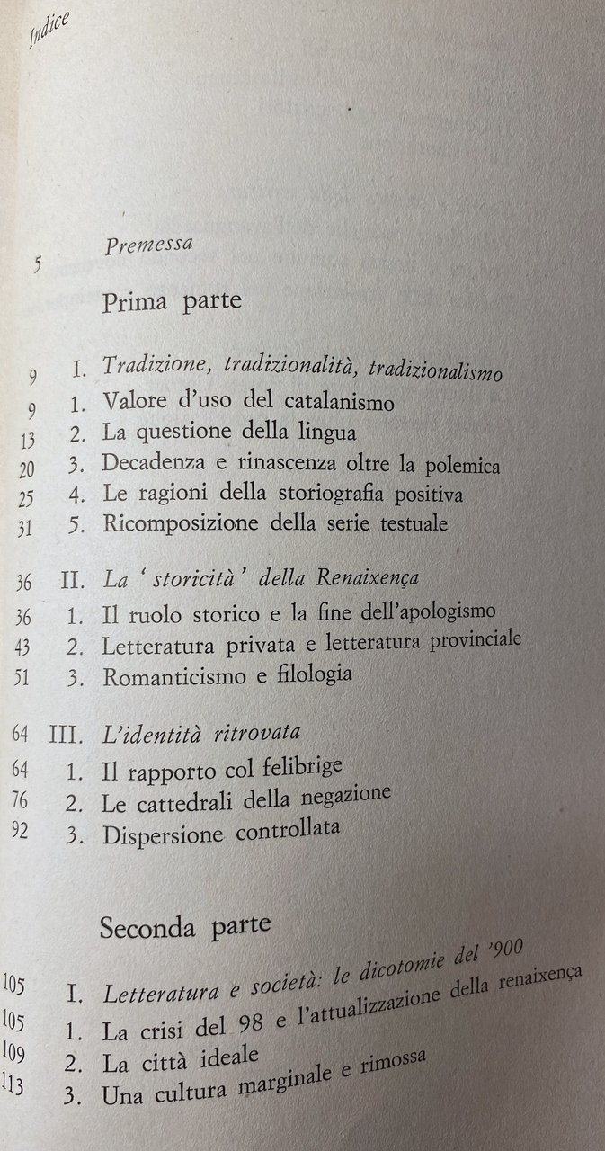 Soggetti: Critica letteraria Letteratura spagnola catalana Cultura Tradizione Tradizionalità Tradizionalismo Catalanismo Questione della lingua Decadenza Rinascenza Polemiche Storiografia Ricomposizione Testi Storicità Renaixença Apologismo Narrativa Privata Provinciale Romanticismo Filologia Identità Felibrige Negazione Dispersione Società Dicotomie Novecento Crisi 98 Città ideale Marginale Rimossa Avanguardia Gruppo Sabadell Rivoluzione Antifascismo Congresso Scrittori Restaurazione Teoria pratica Scrittura Politiche Poetiche Avanguardie Poetica Lingua comune Traslazione Romanzo contemporaneo Scritturazione Cancellazione Libertà Josep Carner Gabriel Ferrater Rinnovamento Futurismo Spagna Rafael Avanguardismo Ortega y Gasset Movimento ultraista Huidobro Immagine creativa Agustín Sánchez Vidal Ideologia Postismo Dopoguerra Manifesto letterario Surrealismo Salvador Dalí Torremolinos Antiartistico André Breton Azorín Barcellona Cansinos Asséns Catalano Cernuda Cinema Cirlot Creazione Cubismo Studi culturali Saggi Dadaismo Dámaso Alonso Ultraismo Díaz Fernández España Española Estetica europea Foix Gaceta Literaria García Lorca Generazione 27 Gerardo Diego Giménez Caballero Greguería Guillermo Torre Hinojosa Intellettuali José María Juan Larrea Juan Ramón Jiménez Lirica Literatura Luis Buñuel Madrid Malaga Marinetti Metafora Modernismo Movimenti Nueva Opere Parigi Picasso Poemas Poesia Politica Prados Prometeo Rafael Alberti Ramón Gómez Revista Occidente Ricezione Salvador Salvat Papasseit Serna Simbolismo Tecnica Tendenze Vallejo Vicente Aleixandre Huidobro Sardegna Alghero Romanzi Buenas Alcover BADIA MARGARIT Ballot Bonaventura Carles Aribau Borghese Letras Carner Castigliana Castigliano Classi Classica COMAS Contraddizioni Estudis Dialettale espanyola Felibriste Garcia Guimerà Hagués Jocs Florals Jordi Rubió Ottocento Moderna Linguistica Llengua Llobregat Mallorca Mediazione Menéndez Milà i Fontanals MOLAS Nicolau d'Olwer Paesi catalani Palma de Mallorca Panorama Popolare Real Academia Regionali Rinascita Ripulsa Riquer Romantica Romanticismo Rubió i Ors XIX SOLDEVILA Storia Trastámara Trobes València Verdaguer vincolata XVII XX Secolo Idioma Castellano Cataluña Renaixement Poetes catalans Cucurull Narcis Oller Verdaguer Jocs Florals Febrer i Cardona Minorca J. Molas Carles Riba Restaurazione Machado Cid Puig Unamuno Baroja Valle Inclan Literary criticism Spanish Catalan literature Culture Tradition Traditionality Traditionalism Catalanism Question of language Decadence Renaissance Polemics Historiography Recomposition Texts Historicity Apologism Private narrative Provincial Romanticism Philology Identity Negation Dispersion Society Dichotomies Twentieth century Crisis Ideal city Repressed Group Revolution Anti-fascism Congress Writers Restoration Practical theory Writing Policies Poetics Avant-gardes Poetics Common language Translation Contemporary novel Writing Cancellation Freedom Renewal Futurism Spain Avant-gardism Ultraist movement Creative image Ideology Post-war Surrealism Anti-artistic Barcelona Catalan Creation Cubism Cultural studies Essays Dadaism Ultraism European aesthetics Generation Intellectuals Literatura Metaphor Modernism Movements Nueva Opere Paris Poetry Politics Prometheus West Reception Symbolism Technique Trends Sardinia Novels Bourgeois Castilian Classes Classical Contradictions Dialectal Nineteenth century Modern Linguistics Mediation Countries Catalan Popular Regional Renaissance Romantic Romanticism History XVII XX Century Language Restoration