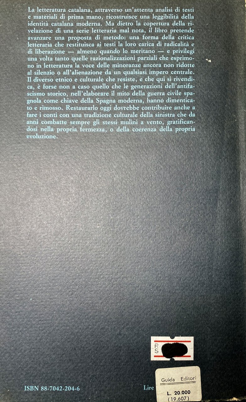 La letteratura catalana, attraverso un'attenta analisi di testi e materiali di prima mano, ricostruisce una leggibilità della identità catalana moderna. Ma dietro la copertura della rivelazione di una serie letteraria mal nota, il libro pretende avanzare una proposta di metodo: una forma della critica letteraria che restituisca ai testi la loro carica di radicalità e di liberazione almeno quando lo meritano e privilegi una volta tanto quelle razionalizzazioni parziali che esprimono in letteratura la voce delle minoranze ancora non ridotte al silenzio o all'alienazione da un qualsiasi impero centrale. Il diverso etnico e culturale che resiste, e che qui si rivendica, è forse non a caso quello che le generazioni dell'antifascismo storico, nell'elaborare il mito della guerra civile spagnola come chiave della Spagna moderna, hanno dimenticato e rimosso. Restaurarlo oggi dovrebbe contribuire anche a fare i conti con una tradizione culturale della sinistra che da anni combatte sempre gli stessi mulini a vento, gratificandosi nella propria fermezza, o della coerenza della propria evoluzione.
