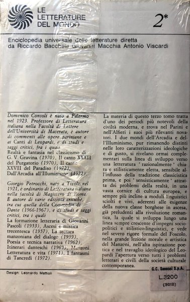 Soggetti: Letteratura italiana, Correnti letterarie, Autori, Critica letteraria, Manuali, Italianistica, Saggi, Libri Vintage, Fuori catalogo, Bibliografia, Opere generali, Narrativa, Romanzi, Romanzo storico, Settecento, ottocento, Illuminismo, Lumi, Scienza, Critici romantici, Poesia, Poetica, Raccolte poetiche, Canti, Impegno civile, Ugo Foscolo, Tragedie, Alessandro Manzoni, Promessi sposi, Risorgimento, Giacomo Leopardi, Lirica, Elegie, Classicismo, Borghesia, Ideologie, Patriottismo, Cultura, Mentalità, Salotti culturali, Studi, Minori, Estetica, Filosofia, Teatro, Drammaturgia, Diritto, Epistolario, Diciottesimo secolo, Grecia, Italian literature, Literary currents, Authors, Literary criticism, Manuals, Italian studies, Essays, Books out of print, Bibliography, General works, Fiction, Novels, Historical novel, 18th century, 19th century, Enlightenment, Science, Romantic critics, Poetry, Poetics, Poetic collections, Songs, Civil commitment, Tragedies, Lyric, Elegies, Classicism, Bourgeoisie, Ideologies, Patriotism, Culture, Mentality, Cultural salons, Studies, Minors, Aesthetics, Philosophy, Theater, Dramaturgy, Law, Epistolary, Eighteenth century, Greece
