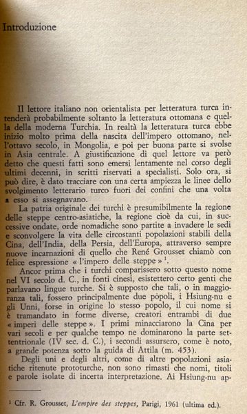 Soggetti: Critica letteraria, Studi culturali, Letteratura turca, Letteratura mongola, Turchia, Mongolia, Saggi, Orientalismo, Opere generali, Autori, Poetica, Poesia, Romanzi, Novelle, Poemi, Impero Ottomano, Persia, Impero persiano, Turchi, Oguz Qaghan, Babur, Arabi, Asia, Caucaso, Steppa, Turcomanni, Pascià, Musulmani, Religione, Islam, Guerra, Conquista, Racconti, Ali-Scer, Letteratura osmanli ottomana, Manuali, Libri Vintage, Fuori catalogo, Bibliografia, Bartol'd, Drammaturgia, Estremo oriente, Giambattista Toderini, Donado, Anatolia, Unione Sovietica, Steiner, Wiesbaden, Fundamenta, Filologia, Grousset, Steppe asiatiche, Lingua, Iscrizioni, Orkhon, Civiltà uigurica, Buddhismo, Testi buddhistici, Sufismo, Amore, Efebi, Frammenti, Muqaddimah di Ibn Haldun, Maometto, Luna, Politica, Popolo, Principi, Ibn Khaldun, Componimenti, Canti, Poemi, Ornato, Gengis Khan, Tamerlano, Invasioni, Scritti religiosi, Codex Cumanicus, Babur, Decadenza, Lirica, Nomadismo, Calmucchi, Stili, Età moderna, Fikret, Ekrem, Tarkhan, Kemal, Gok Alp, Seyfeddin, Qadri, Adivar, Hascim, Ziya, Nazionalismo, Romanticismo, Storiografia, Tulipano, Nabi, Nefi, Narrativa, Vehbi, Celebi, Solimano, Selim I, Baqi, Dede, Sabit, Costantinopoli, Lettere, Negiati, Mesihi, Tursun, Leggende, Cultura, Burhaneddin, Gulscehri, Epopea, Gihansciah, Zarir, Fuzuli, Scià Isma'il, Azerbaigian, Classicismo, Histoire de la littérature turque, Qutlug bolsun, Soufisme, Bouddha, Tradizioni, Poème, Poésie lyrique, Poète, Langage, Langue, Lettres, Littéraire, Littérature, Livre, Turcomans, Ouïghours, Dervisci, Literary criticism, Cultural studies, Turkish literature, Mongolian literature, Turkey, Essays, Orientalism, General works, Authors, Poetics, Poetry, Novels, Poems, Ottoman Empire, Persia, Persian Empire, Turks, Arabs, Caucasus, Turkmen, Pasha, Muslims, Religion, War, Conquest, Tales, Ali-Scer, Ottoman osmanli literature, Manuals, Books out of print, Bibliography, Dramaturgy, Far East, Philology, Asian steppes, Language, Inscriptions, Uigur civilization, Buddhism, Buddhist texts, Sufism, Love, Fragments, Muhammad, Moon, Politics, People, Principles, Components, Songs, Poems, Tamerlane, Invasions, Religious writings, Decadence, Lyric, Nomadism, Styles, Modern age, Nationalism, Romanticism, Historiography, Tulip, Constantinople, Letters, Legends, Culture, Epic, Azerbaijan, Classicism, Traditions, Dervishes