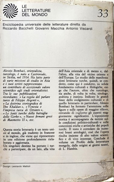 Questa storia letteraria è un testo unico al mondo, già tradotto in francese e in inglese, che viene qui ripresentato in una edizione profondamente rielaborata e aggiornata. L'esposizione storica è accompagnata da notizie sulle condizioni politico-culturali e sulle concezioni etiche e artistiche dei popoli turchi. Il testo è corredato da numerosi brani antologici, così che l'opera risulta insieme di alto valore scientifico e di vivo interesse. Conclude il volume un Profilo della letteratura mongola, dalle origini ai giorni nostri, di L. Hambis. Il volume fa parte di: «Le letterature del mondo», enciclopedia universale delle letterature diretta da Riccardo Bacchelli, Giovanni Macchia e Antonio Viscardi.