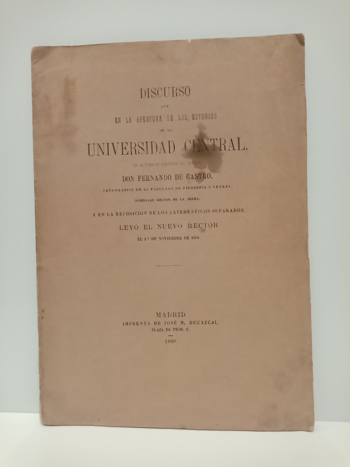 La Libertad de la Ciencia [y] la Independencia de su Magisterio. (Discurso que en la apertura de los estudios de la Universidad Central, en la toma de posesión del Doctor, Don Fernando de Castro, Catedrático de la Facult. de Fil. y Letras, nombrado Rector de la Misma, y en la reposición de los Catedráticos separados, leyó el nuevo Rector el 1º de Noviembre de 1868)