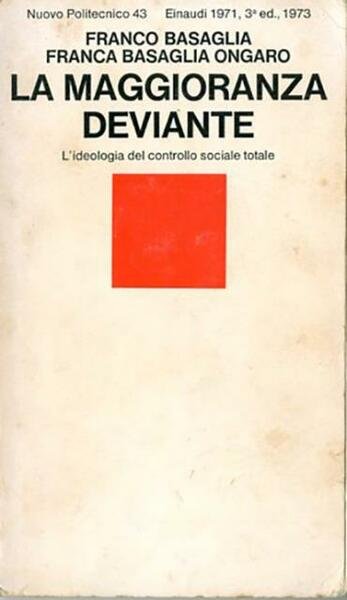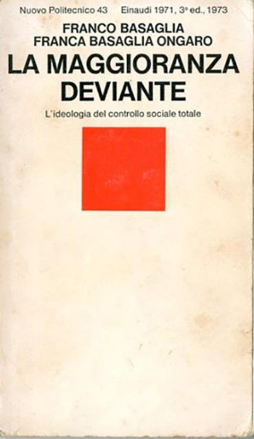 3. ed. 183 p. ; 19 x 11 cm. Nuovo Politecnico, 43. In questo volume Franco Basaglia e Franca Ongaro Basaglia analizzano la tipologia della devianza e il suo inserimento all'interno del contesto sociale ed economico del periodo, quando in Italia la cultura psichiatrica era chiusa in una ideologia della diversità che sanciva l'inferiorità dell'altro (il malato di mente, il bambino difficile, l'immigrato). Il grosso problema che Basaglia mette in luce è costituito dall'organizzazione sociale custodialistico-punitiva, insufficiente a fornire una qualificazione precisa in cui inquadrare il deviante. Sottotitolo della copertina: L'ideologia del controllo sociale totale. Brossura editoriale, coperta in cartoncino flessibile a colori banco/nero e rosso. Qualche sottolineatura a matita per il resto libro integro. Codice libreria 7957.
