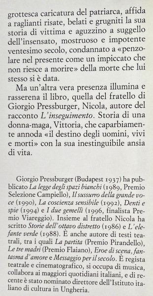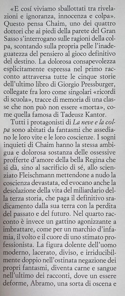 "E così viviamo sballottati tra rivelazioni e ignoranza, innocenza e colpa". Questo pensa Chaim, uno dei quattro dottori che ai piedi della parete del Gran Sasso s'interrogano sulle ragioni della colpa, scontando sulla propria pelle l'inadeguatezza del pensiero al gioco definitivo del destino. La dolorosa consapevolezza esplicitamente espressa nel primo racconto attraversa tutte le cinque storie dell'ultimo libro di Giorgio Pressburger, collegate fra loro come singolari ricordi di scuola, tracce di memoria di una classe che non può essere morta, come quella famosa di Tadeusz Kantor. Tutti i protagonisti di "La neve e la colpa" sono abitati da fantasmi che assediano le loro vite e le loro coscienze. I sogni inquieti di Chaim hanno la stessa ambigua e dolorosa sostanza delle ossessive profferte d'amore della bella Regina che si dà, sino al sacrificio di sé, allo scienziato Fleischmann mettendone a nudo la coscienza devastata, ed evocano anche la desolazione della vita del miliardario della terza storia, che paga il definitivo sradicamento dalla sua terra con la perdita del passato e del futuro. Nel quarto racconto è invece un gattino agonizzante a imbrattare, come per un marchio d'infamia, il volto e il cuore di uno stimato professionista. La figura dolente dell'uomo moderno, lacerato, diviso, e irriducibilmente doppio nell'ostinata negazione dei propri fantasmi, diventa carne e sangue nell'ultimo dei racconti, dove un essere deforme, Abramo, una sorta di oscena e grottesca caricatura del patriarca, affida a raglianti risate, belati e grugniti la sua storia di vittima e aguzzino a suggello dell'insensato, mostruoso e impotente ventesimo secolo, condannato a "penzolare nel presente come un impiccato che non riesce a morire" della morte che lui stesso si è data. Ma un'altra vera presenza illumina e rasserena il libro, quella del fratello di Giorgio Pressburger, Nicola, autore del racconto "L'inseguimento".