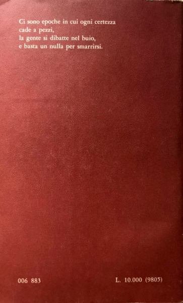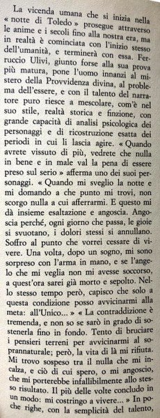 Soggetti: Letteratura italiana, Narrativa contemporanea, Romanzi, Libri Vintage, Fuori catalogo, Novecento, Smarrirsi, Buio, Epoche, Toledo, Storia, Mistero, Provvidenza divina, Umanità, Uomo, Angoscia, Drammatici, Alba, Speranza, Sacro, Profano, Idoli, Destino, Deserto, Anima, Psicologia, Storie bibliche, Morte, Cavalieri, Spagna, Cinquecento, Scandinavia, Romanzo storico, Ebrei, Vita, Crisi esistenziale, Segni divini, Unico, Coscienza, Tenebre, Luce, Surrealismo, Viaggio, Spiritualità, Abisso, Italian literature, Contemporary fiction, Novels, Books not in the catalog, Twentieth century, Borgo San Lorenzo, Lose, Dark, History, Mystery, Divine Providence, Humanity, Man, Anguish, Drama, Dawn, Hope, Sacred, Profane, Idols, Destiny, Desert, Soul, Psychology, Biblical stories, Death, Knights, Spain, 16th century, Historical novel, Jews, Life, Existential crisis, Divine signs, Unique, Consciousness, Darkness, Light, Surrealism, Travel, Spirituality, Abyss