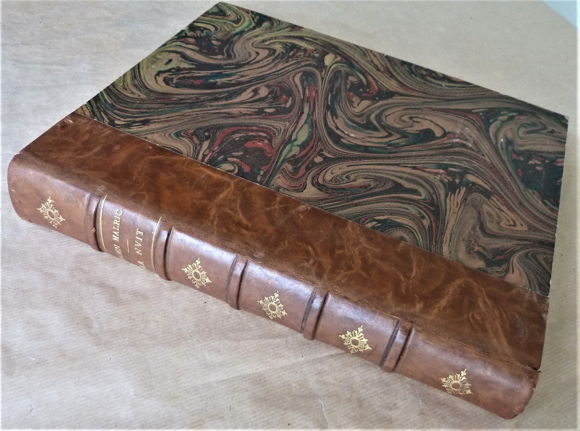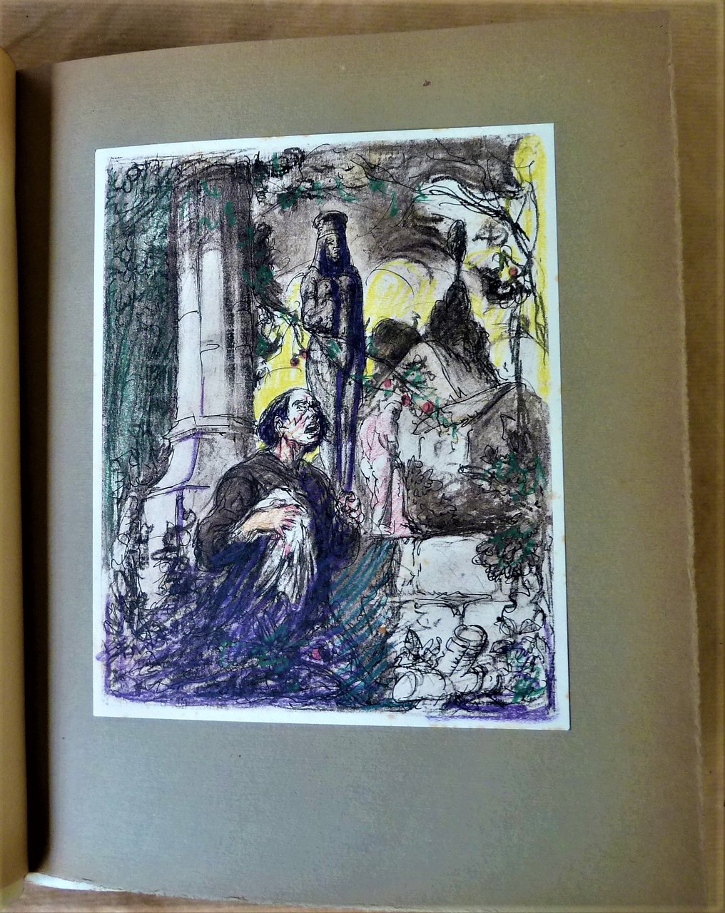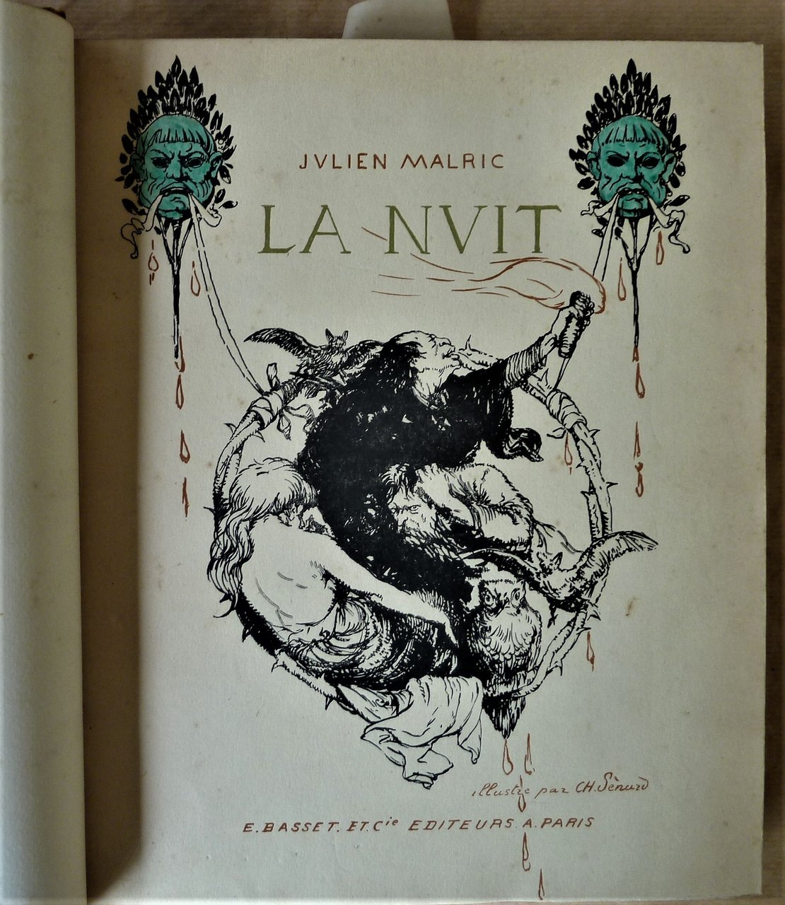 Un fort volume de format grand in 4° de 1 f. (frontispice gravé sur bois; au dos justification du tirage); 184 pp. 8 planches gravées hors texte en double état avec serpentes légendées; couverture conservée. Puis les 8planches non retenues avec sepentes légendées; couverture conservée. Exemplaire sur Hollande van Gelder N°14/ 20, après 10 exemplaires sur Japon. Reliure en demi basane flammé, dos à 5 nerfs; fleurons et titre dorés. Infime défaut à une coiffe, quelques piqures dans le texte; exemplaire désirable. Etrange pièce de théâtre post-symboliste. Voir les photos. Peu fréquent.
