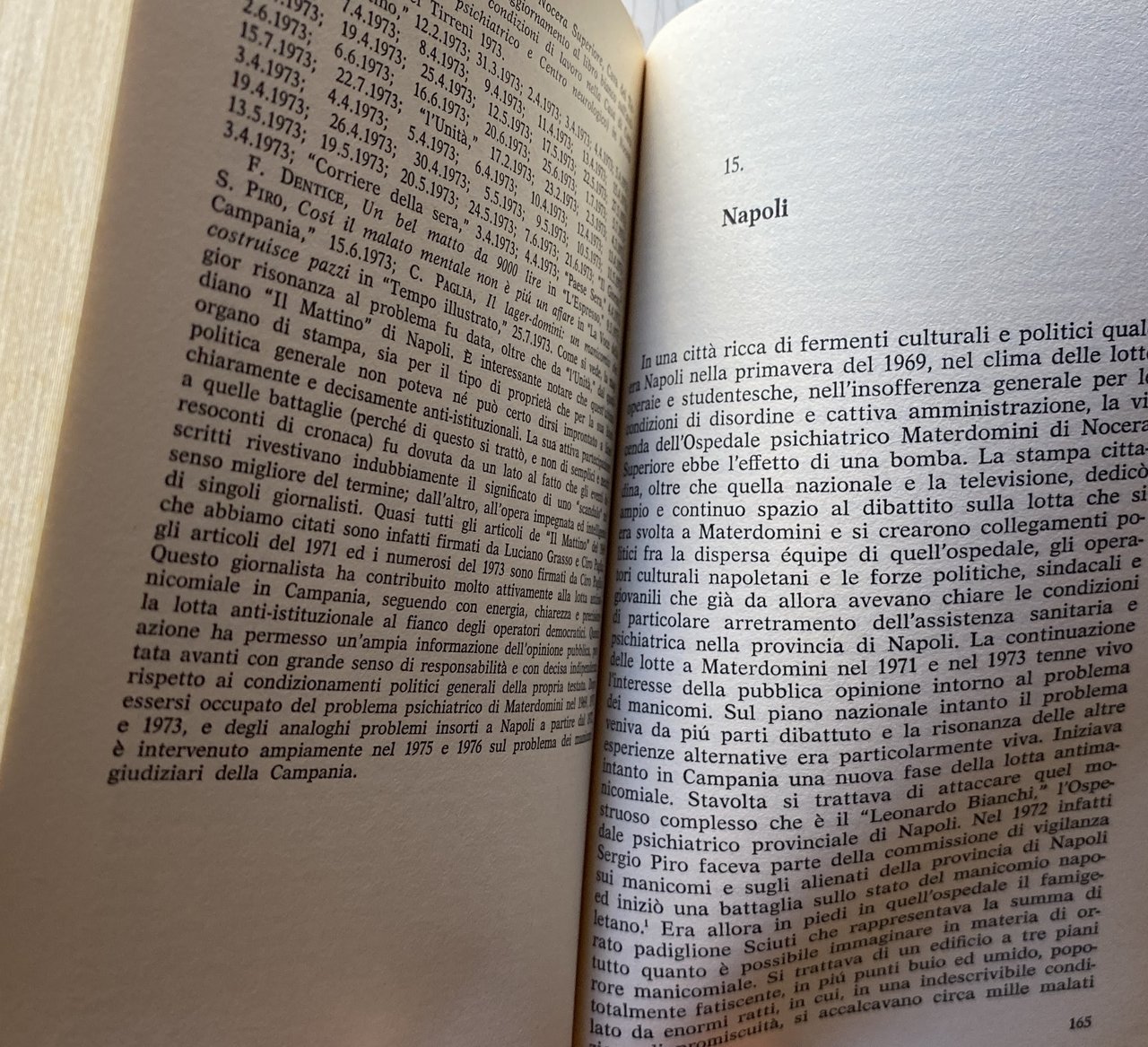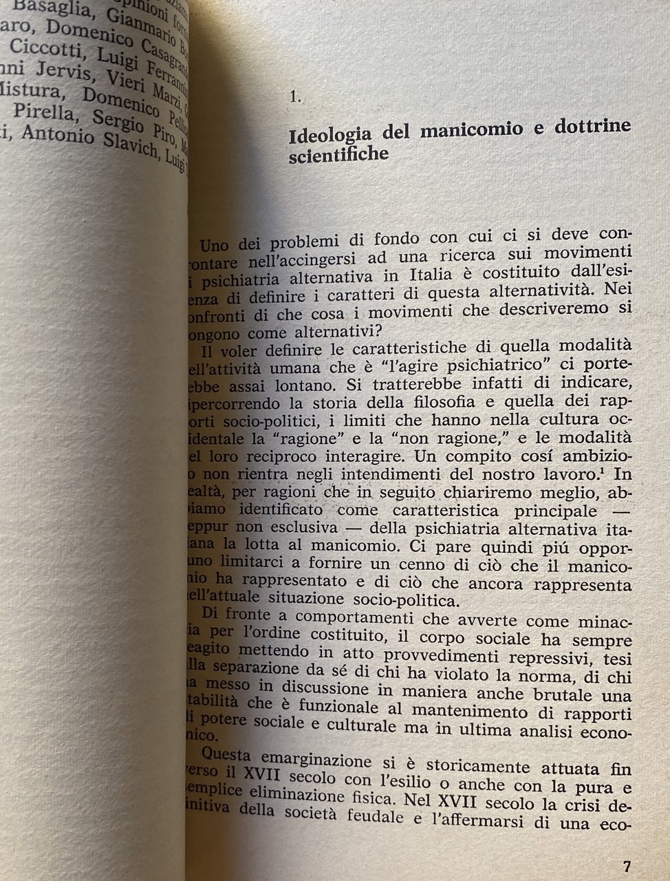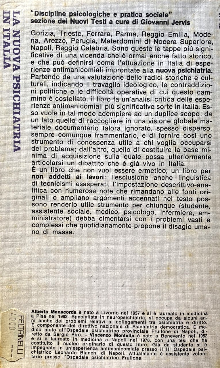 Soggetti: Psichiatria Psicologia Manicomio Franco Basaglia Anni Sessanta Settanta Saggistica Italia Gorizia Orrore Manicomi Malati mentali Esclusi Panopticum Malattia mentale disturbi psichici Ricovero Reclusione Pazienti Ospedali psichiatrici Storia Filosofia Terapia Elettroshock Insulina Internati Tecniche Oppressione Libertà Democrazia Infermieri Psichiatri Istituzione totale Primo Levi RD Laing Erving Goffman Michel Foucault Frantz Fanon Pratiche Comunità terapeutiche sperimentali Regno Unito 1968 1978 Chiusura Sistema Asilo italiano Assistenza sanitaria Movimenti Brutalità Rivoluzione Europa Antipsichiatria Critica Prima Squadra Antipsichiatria Assemblea Generale Fotografia Seconda Squadra Diaspora goriziana Genesi Istituzione negata Mito Realtà Agostino Pirella Antonio Slavich Giorgio Antonucci Arezzo Asylum Giulio Bollati Rieducazione Colorno Campo concentramento Partito Comunista sinistra Intellettuali Politica sanitaria Dibattiti Cotti Dingleton équipe Film Franca Ongaro Basaglia Giacanelli Giannichedda Giovanni Jervis Giulio Esperimento Kingsley Hall L'Unità Letizia Comba Marco Cavallo Mario Tommasini Miklus Milan Morire Perugia Picchio Democratica R.D. Laing Radicali Rasimelli Riforma Reggio Emilia San Lazzaro Sergio Zavoli Torino Venezia Villa Macchina psichiatrizzante Analisi Esperienza Pronto soccorso psichiatrico Perizia Processo penale Scienza giuridica Materdomini Nocera Superiore Antimanicomiale Libri Vintage fuori catalogo Collezionismo Riferimento Bibliografia Studi sociali Reggio Calabria Napoli Liberazione Dorner Zilboorg Decentramento Amministrazione Burocrazia Weber De Giovanni Agire Ideologia Clinica Sindacati Medicina Riabilitazione Cura Legge Mariotti Salute operatori sanitari Dirigenti Vascon Sabbadini Maxwell Jones Recupero Gran Bretagna Inghilterra Belmont Leonardo Bianchi Padiglione Sciuti Vigilanza Violenza Matti Pazzi Isteria Schizofrenia Lager David Cooper Reparto chiuso Reparti Alcolisti Comportamento Degenza Devianza Isolamento Contestazione Contraddizioni Psicoterapia Negazione Partecipazione Suicidio Psychiatry Psychology Mental Hospital Franco Basaglia Sixties Seventies Non-fiction Italy Horror Mental Hospitals Mentally Excluded Panopticum Mental Illness Disorders Hospitalization Imprisonment Patients Psychiatric Hospitals History Philosophy Therapy Electroshock Insulin Internees Techniques Oppression Freedom Democracy Nurses Psychiatrists Total Institution Practices Experimental Therapeutic Communities United Kingdom Closure Italian System Health Care Movements Brutality Revolution Europe Anti-Psychiatry Criticism First Team Anti-Psychiatry General Assembly Photography Second Team Genesis Denied Institution Myth Reality Re-education Concentration Camp Communist Party Left Intellectuals Health Policy Debates Film Experiment Democratic Radicals Rasimelli Reform Venice Psychiatric Machine Analysis Experience Psychiatric Emergency Room Expertise Criminal Trial Legal Science Anti-Psychiatric Hospital Out-of-Print Books Collectibles Reference Bibliography Social Studies Naples Liberation Decentralization Administration Bureaucracy Act Ideology Clinic Unions Medicine Rehabilitation Care Law Health Health workers Managers Recovery Great Britain England Ward Vigilance Violence Mad Madmen Hysteria Schizophrenia Closed Ward Wards Alcoholics Behavior Hospitalization Deviance Isolation Contestation Contradictions Psychotherapy Denial Participation Suicide