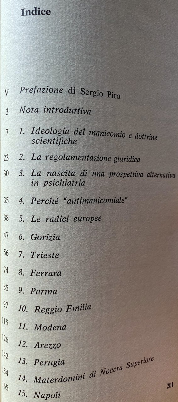 Trieste, Ferrara, Parma, Reggio Emilia, Modena, Arezzo, Perugia, Materdomini di Nocera Superiore, Napoli, Reggio Calabria. Sono queste le tappe più significative di una vicenda che è ormai anche fatto storico, e che può definirsi come l'attuazione in Italia di esperienze antimanicomiali improntate alla nuova psichiatria. Partendo da una valutazione delle radici storiche e culturali, indicando il travaglio ideologico, le contraddizioni politiche e le difficoltà operative di cui questo cammino è costellato, il libro fa un'analisi critica delle esperienze antimanicomiali più significative sorte in Italia. Esso vuole in tal modo adempiere ad un duplice scopo: da un lato quello di raccogliere in una visione globale materiale documentario talora ignorato, spesso disperso, sempre comunque frammentario, e di fornire così uno strumento di conoscenza utile a chi voglia occuparsi del problema; dall'altro, quello di costituire la base minima di acquisizione sulla quale possa ulteriormente articolarsi un dibattito che è già vivo in Italia. È un libro che non vuol essere ermetico, un libro per non addetti ai lavori: l'esclusione anche linguistica di tecnicismi esasperati, l'impostazione descrittivo-analitica con numerose note che rimandano alle fonti originali o ampliano argomenti accennati nel testo possono renderlo utile strumento per chiunque (studente, assistente sociale, medico, psicologo, infermiere, amministratore) debba cimentarsi con i problemi vasti e complessi che quotidianamente propone il disagio umano di massa.