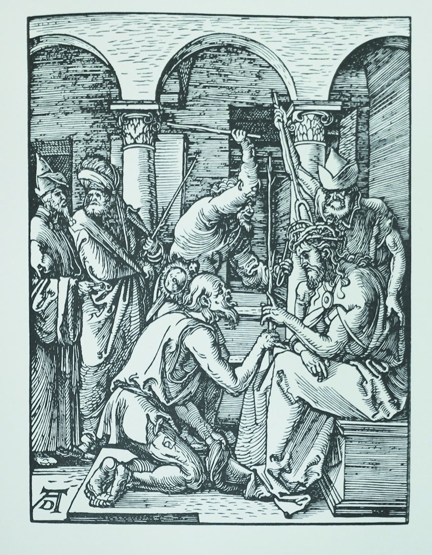 In-8 p., legatura edit. in mz. pelle, astuccio con cuffie in pelle, pp. 218,(4). Trentasei poesie latine, con le 36 xilografie a fronte e quella del frontespizio, reincise da Leonardo Farina secondo la prima edizione del 1511, con la traduzione italiana in versi di Enzio Cetrangolo e uno studio di Giovanni Mardersteig sull'opera del Duerer e di Fra' Chelidonius.La "Passio Christi" qui ripubblicata, detta per lo più "Piccola Passione" e che si differenzia dalla "Grande Passione" anche per il suo formato più maneggevole, viene considerata il capolavoro fra i vari cicli sulla Passione di Duerer. Come nella prima, rarissima edizione del 1511, anche questa stampa contiene i versi di Frater Benedictus Chelidonius, scritti per incarico di Duerer per illustrarne le scene.Cfr. Cat. Mardersteig,171. Tiratura di 135 esemplari numerati, su carta a mano Magnani. Il ns., 52, è in perfetto stato.