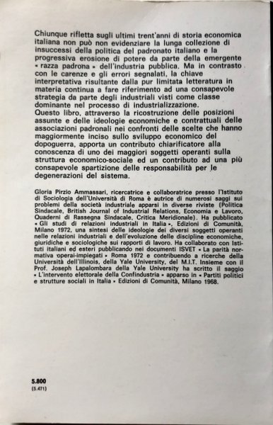 Soggetti: Scienze sociali, Sociologia industriale e del lavoro, Storia industriale, Politica economica, Economia, Confindustria, Industrializzazione, Potere, élite, Classe dirigente, Sindacati, Contrattazione, Operai, Diritti, Ideologie, Dopoguerra, Ricostruzione, Crescita, Sviluppo economico, Parti sociali, Dialettica, Borghesia, Etica, Capitalismo, Marxismo, Lotta di classe, Liberismo, Stato, Nazionalizzazione, Energia elettrica, Presidenza, Vertici, Riforma Pirelli, Rinnovi contrattuali, Lombardi, Umberto Agnelli, Gianni, Federmeccanica, Rendite parassitarie, Riforme, Valeri Manera-Giustino-Modiano, Italia, Produzione, CGIL, Corriere della Sera, Costa, De Micheli, IRI, Mattei, Visentini, Cianci, Impresa, Industriali italiani, Aiuti, Organizzazione padronale, Società, Cariche, Guido Carli, Liberalizzazione, Scambi commerciali, Metalmeccanici, Relazioni industriali, Modernizzazione, Gerschenkron, Libri Vintage, Fuori catalogo, Social sciences, Industrial and labor sociology, Industrial history, Economic policy, Economy, Confindustria, Industrialization, Power, Elite, Ruling class, trade unions, Bargaining, workers, rights, ideologies, post-war, reconstruction, growth, economic development, social partners, Dialectics, Bourgeoisie, Ethics, Capitalism, Marxism, Class struggle, Liberism, State, Nationalization, Electricity, Presidency, Summits, Contract Renewals, Parasitic Annuities, Reforms, Italy, Production, Enterprise, Italian industrialists, Aid, Master organization, Company, Offices, Liberalization, Trade, Metalworkers, Industrial relations, Modernization, Vintage books, Out of print catalog
