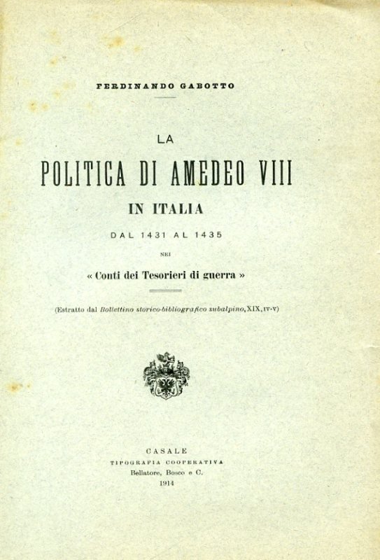 La politica di Amedeo VIII in Italia dal 1431 al 1435 nei 'Conti dei Tesorieri di Guerra' (Estratto dal Bollettino storico - bibliografico subalpino, XIX, IV - V)