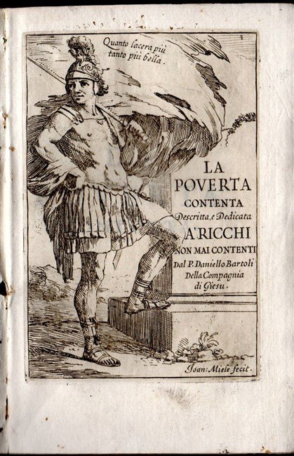 in-16, pp. (10), 384, leg. p. perg. coeva con tit. mss al d. Antip. inc. in rame da G. Miele. Iniziali xilogr. Rara ediz. orig. dell'unica opera sul pauperismo del gesuita originario di Ferrara (1608-1685). Piantanida 3335. Mancanza di alcuni cm di pergamena al d. Forellini di tarlo che interessano parzialmente il testo su 5 carte, qualche pagina brun. Per il resto buon esempl a larghi margini su carta forte. [106]