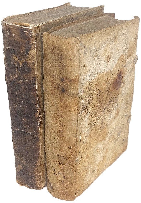 >2 volumi in-8 (162x110 mm), pp. (32), 450, (numerosi errori nella paginazione); (155x105 mm), pp. (1), 22, (2); (16), 450 (rilegato con inversioni da p. 128 a p. 145, ma completo), (30). Legatura coeva in pergamena floscia e tracce di bindelle. Impresa dello stampatore ai titoli, illustrazioni n.t. per il vol. secondo; precedono il testo dediche a papa Giulio III e Ippolito d'Este. Prima edizione di ambedue le parti della Filosofia Naturale del Piccolomini, rare a trovarsi unite, in legature uniformi. Il trattato, diviso in complessivi 8 libri, affronta le principali teorizzazioni della filosofia naturale (definizione di materia, spazio, luogo...). Alessandro Piccolomini (Siena, 1508 -1579) fu vescovo titolare di Patrasso e Coadiutore dell'Arcivescovo di Siena dal 1574, Professore di Filosofia all'Università di Padova dal 1540, filosofo, teorico dell'arte e studioso di lettere classiche, fu astronomo e difensore della teoria tolemaica, autore dell'Orazione in lode delle donne (Roma 1549) e di numerosi trattati astronomici. Opera estremamente rara (legature con macchie, aloni di polvere ai titoli. Nota di possesso coeva al vol. II: "Ioannis Antonii Fabri Maceratensi"). STC 513. Adams P-1117 (seconda parte). Graesse V, 281. Manca a Gamba.