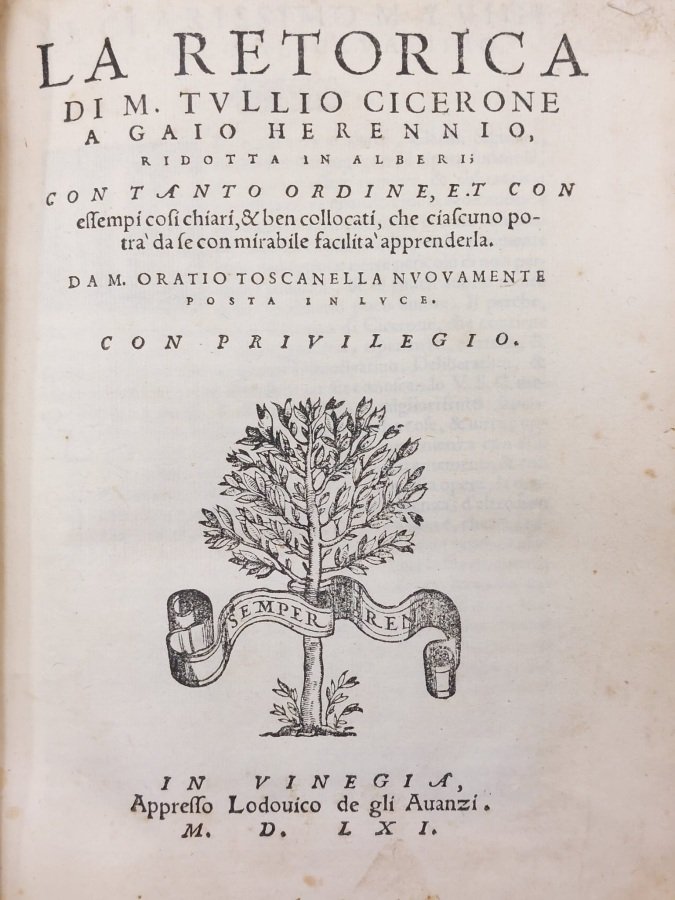 <span style="font-style: normal;"><span style="font-style: normal;">In-4° (cm. 20,3), legatura in piena pergamena con dorso a nervi rinforzato (alcune macchiette ai piatti); tagli marmorizzati in rosso; cc. [6] 174 in stato molto buono (alcune fioriture). «</span><i>Con tanto ordine, et con essempi così chiari e ben collocati, che ciascuno potrà da se con mirabile facilità apprenderla. Da M. Oratio Toscanella nuouamente posta in luce</i>». Con 6 grandi tavole fuori testo più volte ripiegate; bella marca silografica al frontespizio raffigurante un albero con il motto <i>Semper Virens </i>e capolettera elegantemente figurato in silografia all'</span><i>incipit</i> della dedicatoria. Edizione non comune. Antica firma di appartenenza al frontespizio. Esemplare molto buono. (NQ3)