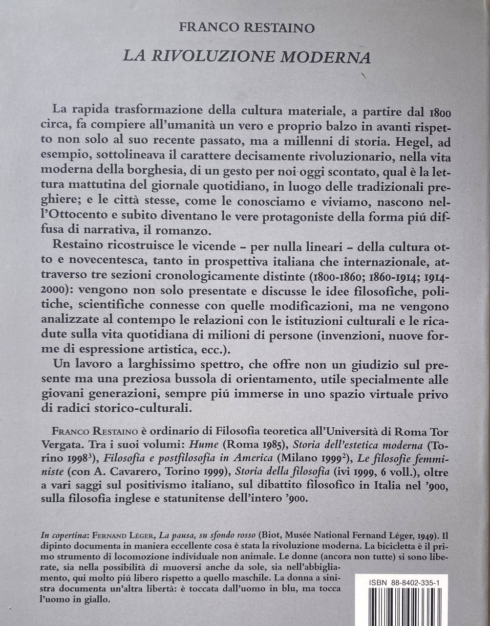 In copertina: FERNAND LEGER, La pausa, su sfondo rosso (Biot, Musée National Fernand Léger, 1949). 11 dipinto documenta in maniera eccellente cosa è stata la rivoluzione moderna. La bicicletta è il primo strumento di locomozione individuale non animale. Le donne (ancora non tutte) si sono liberate, sia nella possibilità di muoversi anche da sole, sia nell'abbigliamento, qui molto più libero rispetto a quello maschile. La donna a sinistra documenta un'altra libertà: è toccata dall'uomo in blu, ma tocca l'uomo in giallo.
