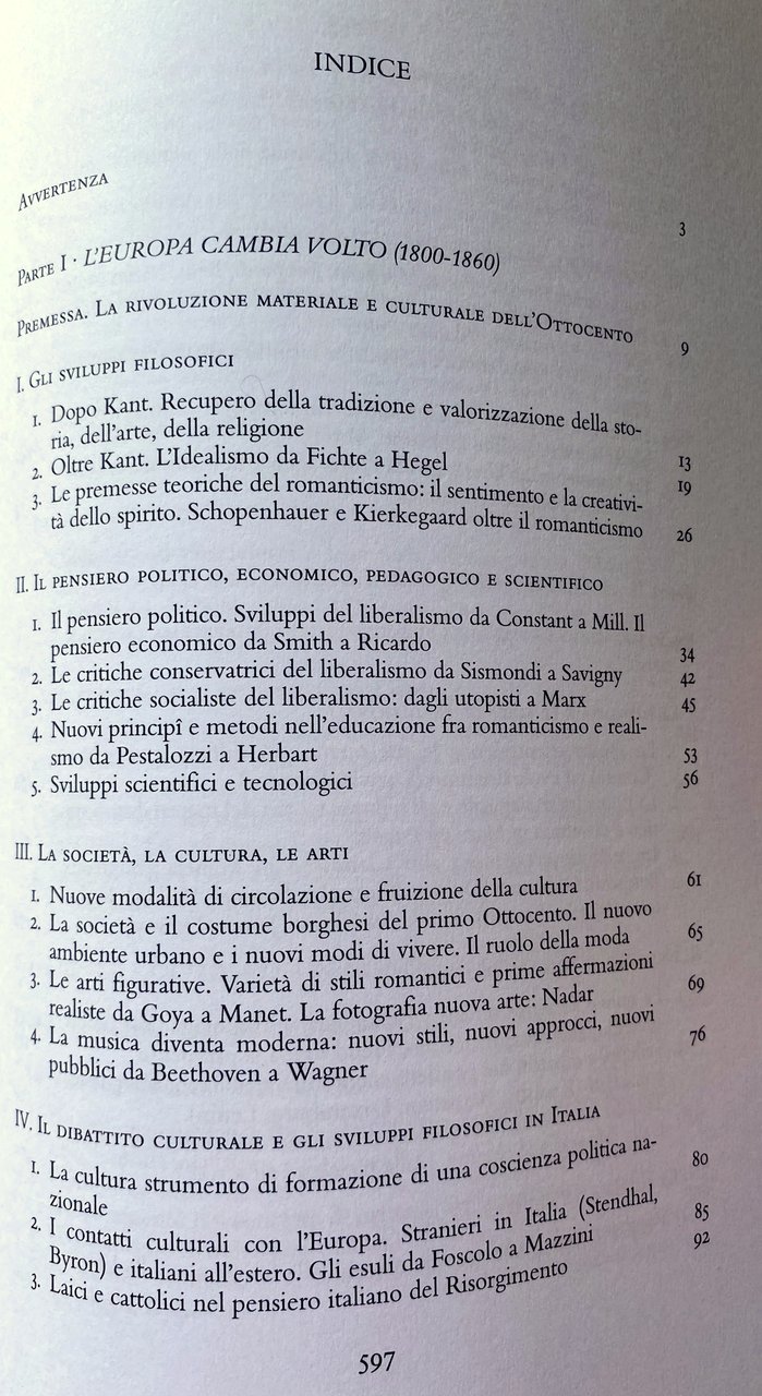 Soggetti: Manuali, Storia contemporanea, Novecento, Ottocento, Filosofia, Arte, Pedagogia, Scienza, Didattica, Formazione, Consultazione, Bibliografia, Riferimento, Letteratura, Libri di testo scolastici, Università, Scuola, Estetica moderna, Politica, Ideologie politiche, Cultura di massa generale, Religione, Idealismo, Etica, Kant, Fichte, Hegel, Schopenhauer, Kierkegaard, Romanticismo, Positivismo, Correnti di pensiero, Liberalismo, Postmodernismo, Modernità, Tecnologia, Tecnica, Borghesia, Società, Economia, Capitalismo, Globalizzazione, Smith, Ricardo, Stuart Mill, Benjamin Constant, Sismondi, Savigny, Utopia, Marxismo, Marx, Realismo, Pestalozzi, Herbart, Musica, Arti figurative, Pittura, Scultura, Moda, Urbanesimo, Architettura, Goya, Manet, Monet, Fotografia, Nadar, Beethoven, Wagner, Circoli culturali, Laicismo, Risorgimento, Ugo Foscolo, Stendhal, Lord Byron, Libertà, Resistenza, Democrazia, Giuseppe Mazzini, Stampa, Editoria, Intellettuali, Scienze umane, Progresso scientifico, Lirica, Impressionismo, Espressionismo, Futurismo, Cubismo, Guerre mondiali, Cinema, Teatro, Esistenzialismo, Psicanalisi, Antropologia, Psicologia, Opere generali, Principio di indeterminazione, Atomo, Materia, Relatività, Energia, Sociologia, Linguistica, Canzone, Spettacolo, Televisione, Internet, Avanguardie, Produzione letteraria, Maria Montessori, Educazione, Legge Casati, Gaetano Mosca, Pantaleoni, Wilfredo Pareto, Cattolicesimo, Contestazione, Femminismo, Sessantotto, Anni Settanta, Villari, Ardigò, Bertrando Spaventa, Laicismo, Clericalismo, Fascismo, Comunismo, Nazismo, Antisemitismo, Fumetto, Marginalismo, Kautsky, Bernstein, Rosa Luxemburg, Lenin, Belle époque, Scientismo, Freud, Jung, Lacan, Comte, Darwin, Spencer, Engels, Boutroux, Materialismo storico, Dialettica, Lotta di classe, Bergson, Dilthey, Simmel, Weber, Nietzsche, Moore, Russell, Peirce, James, Dewey, Eurocentrismo, Europa, America, Evoluzionismo, Medicina, Genetica, Scoperte, Opera, Verdi, Donizetti, Bellini, Rossini, Canova, Piermarini, Valadier, Hayez, Classicismo, Eclettismo, Carnap, Quine, Popper, Kuhn, Diritto, Hans Kelsen, Carl Schmitt, Rawls, Narrativa, Fumetti, Consumismo, Generi, Stile, Jazz, Rock, Anni Venti, Anni Trenta, Dopoguerra, Benedetto Croce, Panisperna, Ricerca, Fisica, Nucleare, Enrico Fermi, Rasetti, Dibattiti, Riforme, Giovanni Gentile, Rotocalchi, Giornali, Industria culturale, Cantautori, Band, Rivoluzione, Masse, Trasporti, Locomozione, Aereo, Metropoli, Città, Megalopoli, Riproducibilità, Serialità, Critica, Italia, Francia, Germania, Fenomenologia dello spirito, Dottrine politiche, Ludwig Wittgenstein, Stefan Zweig, Federico Zeri, Giambattista Vico, Bruno Zevi, Frank Sinatra, Frank Zappa, Beatles, Rolling Stones, Virginia Woolf, Orwell, Whitehead, Carlo Augusto Viano, Vidotto, Luchino Visconti, Fellini, Vittorini, Quasimodo, Van Gogh, Gianni Vattimo, Andy Warhol, Finzi Vegetti, Vertov, Jean Vigo, Emilio Segrè, Sereni, Scoppola, Cesare de Seta, Emanuele Severino, Cacciari, Georg Simmel, Shelley, Stalin, Sorel, Italo Svevo, Stravinskij, Tagore, Terragni, Tessitore, Tocqueville, Togliatti, Ungaretti, Vacca, Gabriele Turi, François Truffaut, Alfred Hitchcock, Kubrick, Trotskij, Luigi Sturzo, Tranfaglia, Tarantino, Recalcati, Romagnosi, Paolo Rossi, Auguste Perret, Sabbatucci, Saitta, Salvatorelli, Saba, Rousseau, Salvemini, Savinio, Scarfoglio, Eduardo De Filippo, Schelling, Schiller, Schleiermacher, Pareyson, Pasquino, Pascoli, Pablo Picasso, Péguy, Luigi Pirandello, Edgar Allan Poe, Karl Popper, Quine, Ragghianti, Puccini, Proust, Mario Praz, Enzo Paci, Pier Paolo Pasolini, Mirò, Matisse, Montesquieu, Moore, Montale, Monicelli, Mondrian, Domenico Modugno, Amedeo Modigliani, Giorgio Morandi, Murialdi, Mozart, Mussolini, Natorp, Novalis, Kojève, Kracauer, Labriola, Antonio Gramsci, Imre Lakatos, Fritz Lang, Le Corbusier, Led Zeppelin, Lisitskij, Lévy-Strauss, Liala, Levi, Levinas, Lukacs, Lowith, Lyotard, Thomas Mann, Manzoni, Leopardi, Luporini, Claudio Magris, Enrico Malato, Corto Maltese, Tommaso Marinetti, Marcuse, Marconi, Tullio Gregory, Martin Heidegger, Hermann Hesse, Hitler, Renato Guttuso, Griffith, Husserl, Ionesco, Jakobson, Noam Chomsky, Keynes, Paul Klee, Kafka, James Joyce, Jaspers, Jemolo, Eric Hobsbawm, Kandinskij, Jannacci, Dario Fo, Totò, Gustav Klimt, Fichte, Fenoglio, Froebel, Gaber, Fourier, Foucault, Franco Fortini, Gadda, Einstein, Newton, Galbraith, Füssli, Erich Fromm, James Frazer, Eugenio Gaber, Ginzburg, Agostino Gemelli, Giolitti, Vincenzo Gemito, Goethe, Goncourt, Gorkij, Gogol, Dostoevskij, Turgenev, Tolstoj, Philip Glass, Man Ray, Geymonat, Ghidetti, Gauss, Henry Ford, Ferrarotti, Dal Pra, Gabriele D'Annunzio, Miles Davis, De Chirico, Decroly, Vittorio De Sica, Jacques Derrida, Filippo De Pisis, De Micheli, Adorno, Horkheimer, Depero, Tullio De Mauro, Eugène Delacroix, Deledda, Edgar Degas, De Gasperi, Renato De Fusco, Gabriele De Rosa, De Sanctis, Dumas, Duchamp, Walt Disney, Fernando Di Giammatteo, Salvatore Di Giacomo, Bob Dylan, Umberto Eco, Luigi Einaudi, Engels, Escher, Dorfles, Collodi, Claparède, Ernesto Codignola, Charlie Chaplin, Courbet, Cavour, Garibaldi, Carducci, Italo Calvino, Donizetti, Valerio Castronovo, Cambi, Canova, Caruso, Cartier-Bresson, Brecht, Leonardo Benevolo, Battiato, Lucio Battisti, Jean Baudrillard, Samuel Beckett, Bizet, Bellonci, Norberto Bobbio, Umberto Boccioni, Boito, Achille Bonito Oliva, Bordiga, Gian Piero Brunetta, Cechov, Alvar Aalto, Nicola Abbagnano, Gianni Agnelli, Sibilla Aleramo, Albertini, Alinari, Althusser, Amendola, Bakunin, Banfi, Balbo, Jane Austen, Argan, Armstrong, Bach, Joan Baez, Cattaneo, Louis Ferdinand Céline, Capra, Frank Sinatra, Madonna, Michael Jackson, Marc Chagall, Chabod, Metafisica, Ecologia, Ambientalismo, Turismo, Viaggio, Proletariato, Fabbriche, Sindacalismo, Diritti sociali civili, Battaglie, Rivolte, Geopolitica, Equilibrio, Terrorismo, Radicalismo, Immigrazione, Lavoro, Precarie