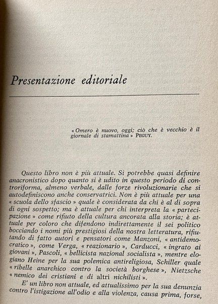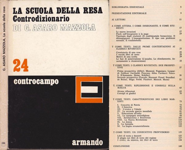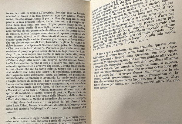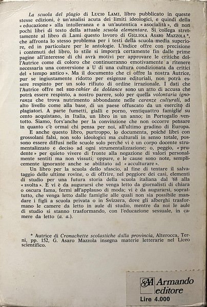 Soggetti: Filosofia, Educazione, Formazione, Pedagogia, Didattica, Libri scolastici italiani, Scuole medie superiori, Italia, Scuola media, Alunni, Docenti, Insegnamento, Critica letteraria, Linguistica, Linguaggio, Dizionari, Consultazione, Riferimento, Libri Vintage Fuori catalogo, Cultura classica, Anni Settanta, Collezionismo, Libri rari, Bibliografia, Declino culturale, Salvatore Valitutti, Aldo Visalberghi, Antimo Negri, Roberto Mazzetti, Ugo Spirito, Fallimento, Luigi Volpicelli, Esami, Materie scolastiche, Programmi, Valutazione, Studenti, Apprendimento, Letteratura, Classici, Manuali, Antifascismo, Resistenza, Valori, Educazione civica, Fascismo, Regime, Dopoguerra, Plagio, Sinistra, Intellettuali, Testi adottati, Famiglia, Ruoli, Società, Donna, Emancipazione, Idealismo, Seconda Guerra Mondiale, Liberazione, Marxismo, Libri marxisti, Storia contemporanea, Vincitori, Storiografia, Tesi, Patria, Eroismo, Vittoria, Carattere, Personalità, Impegno, Disturbi, Età evolutiva, Rivisitazione, Alfieri, Manzoni, Fogazzaro, Leopardi, Goldoni, Garibaldi, Pascoli, Carducci, D'Annunzio, Stendhal, Freud, Foscolo, Petofi, Balzac, Hugo, Masoch, Flaubert, Mann, Riflessioni, Proposte, Gerarchie, Autoritarismo, Limiti, Scelta del Libro, Editoria, Stampa, Lorenzo Milani, Chiesa, Religione, Lukacs, Rivoluzione, Dio, Patria, Umberto Eco, Faure, Bini, Polemiche, Antologie, Salinari, Paganini, Sussidiari, Magni, De Boni, Tedeschi, Bongioanni, Bonfiglioli, Scognamiglio, Russo, Piscopo, Borghesia, Conoscenza, Luciano Lami, Ideologie, Limiti, Elementari, Contenuti, Temi, Carenze, Lacune, Critici, Acculturazione, Svolta, Sessantotto, Ribellione, Lettura, Scrittura, Istruzione, Ministero, Philosophy, Education, Training, Pedagogy, Didactics, Italian school books, High schools, Italy, Middle school, Pupils, Teachers, Teaching, Literary criticism, Linguistics, Language, Dictionaries, Consultation, Reference, Out of print books, Classical culture, Years Seventies, Collecting, Rare books, Bibliography, Cultural decline, Failure, Exams, School subjects, Programs, Evaluation, Students, Learning, Literature, Classics, Manuals, Antifascism, Resistance, Values, Civics, Fascism, Regime, Postwar, Plagiarism, Left, Intellectuals, Adopted texts, Family, Roles, Society, Woman, Emancipation, Idealism, Second World War, Liberation, Marxist books, Contemporary history, Winners, Historiography, Theses, Homeland, Heroism, Victory, Character, Personality, Commitment, Disorders, Evolutionary age, Review, Reflections, Proposals, Hierarchies, Authoritarianism, Limits, Choice of the book, Publishing, Press, Church, Religion, Revolution, God, Homeland, Controversies, Anthologies, Subsidiary, Bourgeoisie, Knowledge, Ideologies, Limits, Elementary, Contents, Themes, Deficiencies, Gaps, Critics, Acculturation, Turn, Sixty-eight, Rebellion, Reading, Writing, Education, Ministry