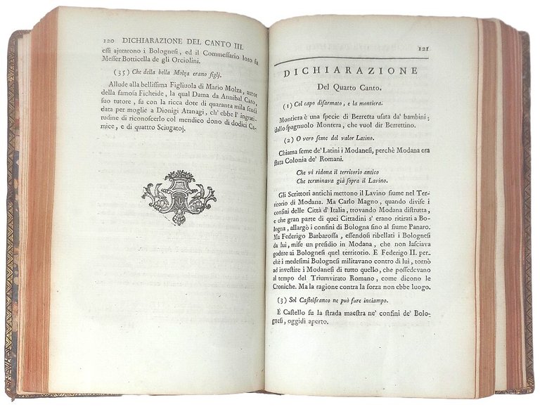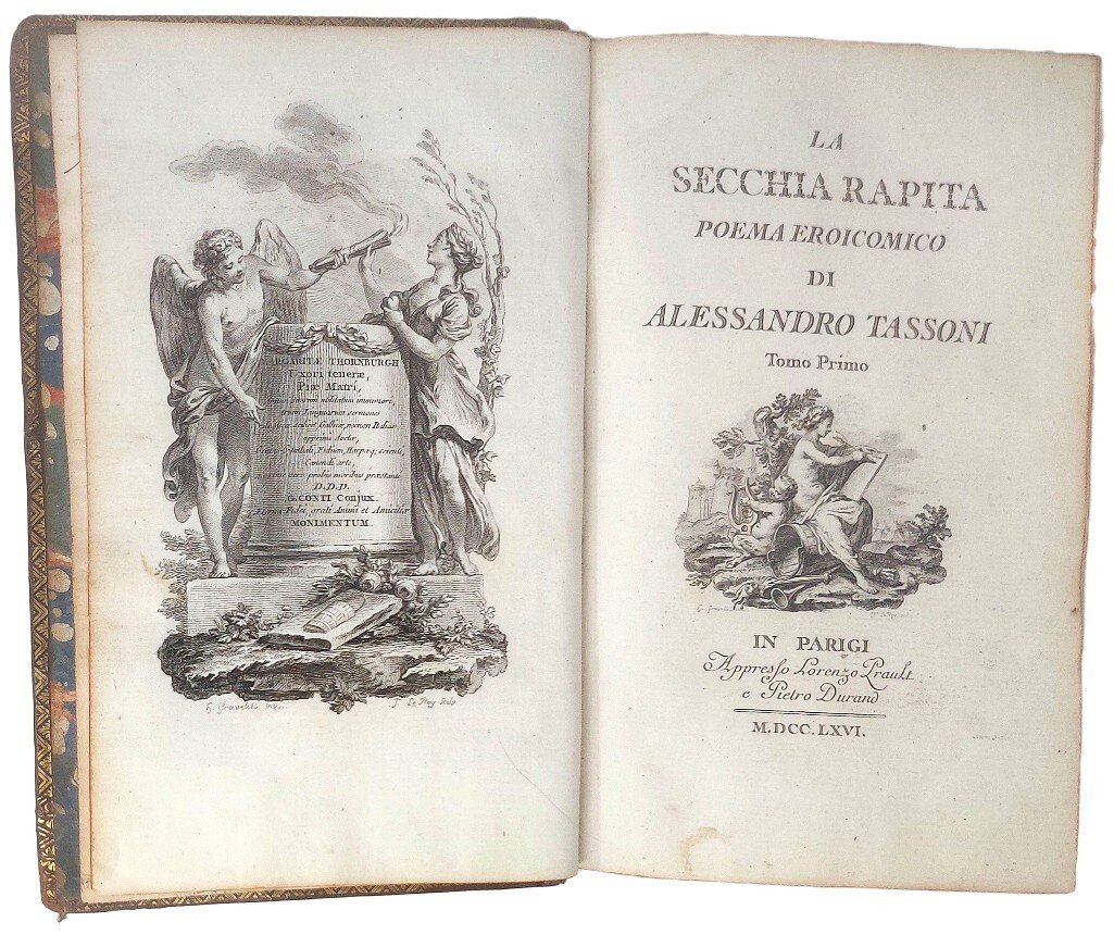 >2 volumi in 1 tomo, in-8, pp. CVIII, 128; 239, (1), bella legatura del tempo in vitello marmorizz., cornice a filetti oro sui piatti, tit. e ricchi fregi in oro ai dorsi lisci (cerniere restaurate), tagli rossi. Stupenda edizione illustrata: 2 titoli incisi con differente vignetta, dedica inc. in antiporta, ritratto in medaglione, 12 testate e 12 finalini inc. da Le Roy e 12 tavole f.t. finem. inc. da Duclos, Née, Le Roy, Pasquier, Rousseau e Simonet, il tutto dai disegni di Gravelot. Precedono la Vita dell'autore scritta da L.A.Muratori e le Riflessioni di Pietro Perrault; in fine ad entrambi i volumi le Dichiarazioni dello stesso Tassoni. Com'è noto, "La secchia rapita", composta in ottava rima, pubblicata per la prima volta a Parigi nel 1622, è sicuramente l'opera più famosa di A. Tassoni (Modena 1565-1635) ed uno dei poemi più fortunati e meglio riusciti del genere eroicomico della letteratura italiana. Notissima è la trama: durante una scaramuccia tra bolognesi e modenesi, quest'ultimi riescono a penetrare nel cuore di Bologna dove, assetati, rubano una secchia da un pozzo e, rifiutandone la restituzione, scatenano una complicatissima guerra che si concluderà solo grazie all'intermediazione del legato pontificio. Nonostante l'azione si svolga nel sec. XIII, i riferimenti alla contemporaneità sono numerosi ed espressi con arguzia e vivacità. Buon esemplare. Cohen-Ricci 980-81: «Jolie édition bien illustrée». Boissais-Deleplanque 168. Gamba 2097, note: «Tra le moderne (stampe) poi le più splendide per lusso tipografico sono un'edizione di Parigi, Prault, 1766..».
