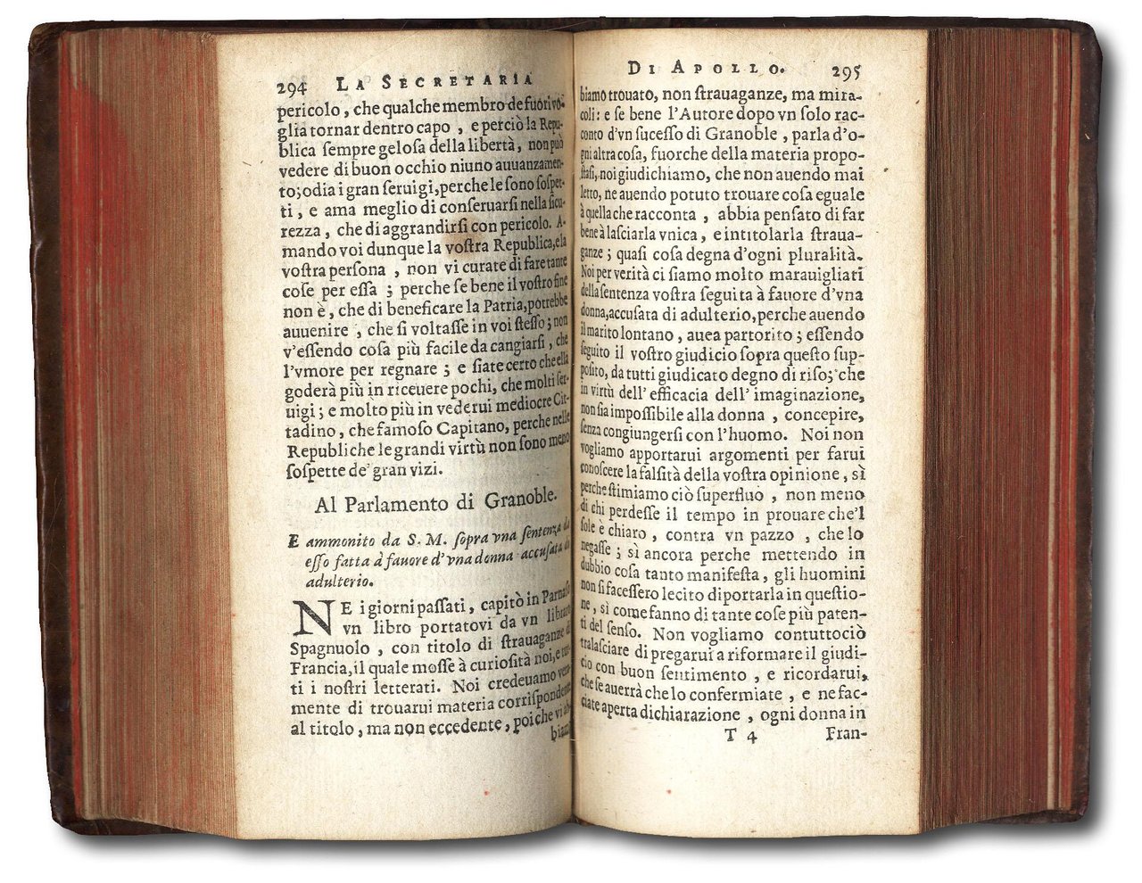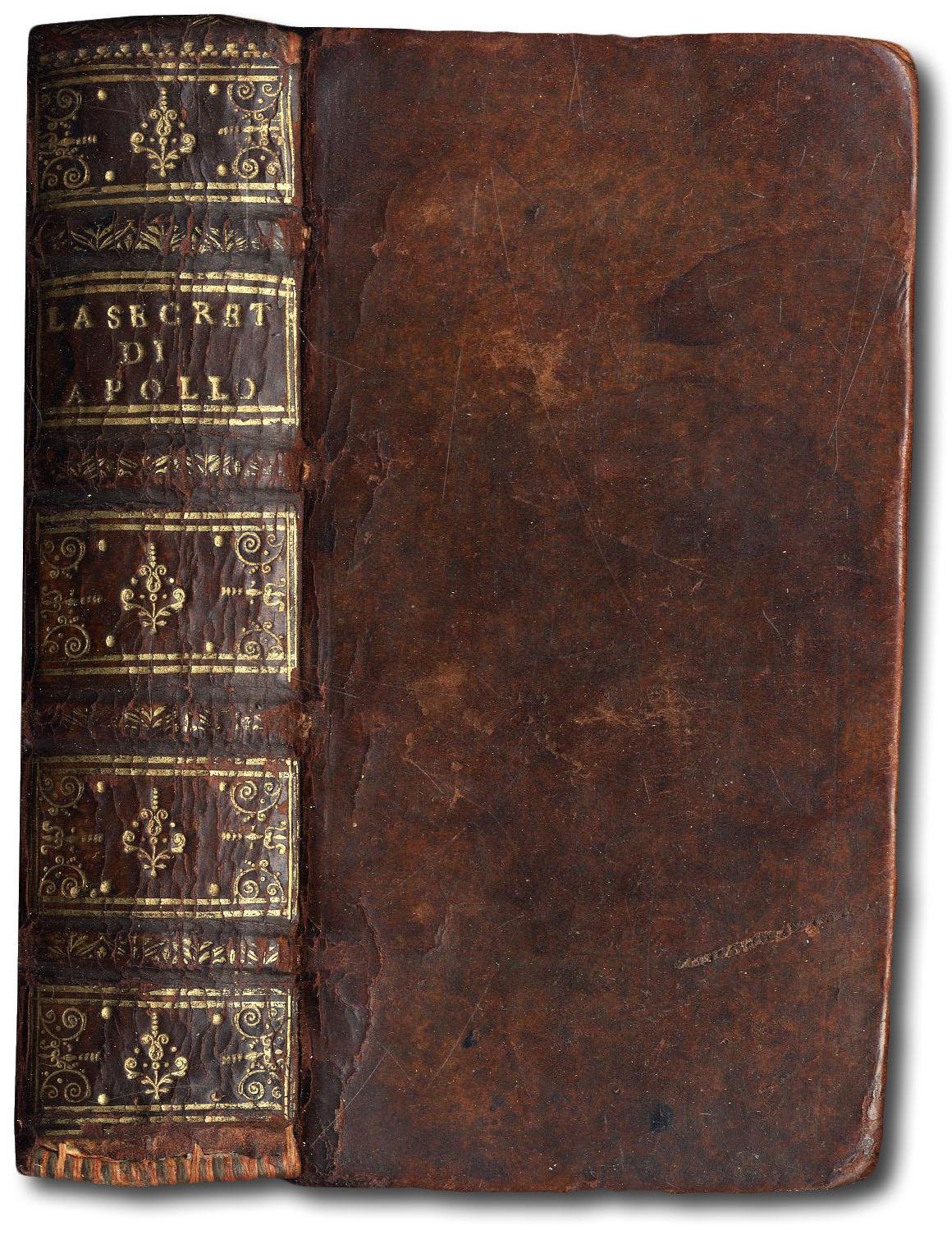 >in-24, (120 x 60 mm), pp. 570, (6), legatura coeva pelle, dorso a nervi con titolo e fregi oro, tagli rossi. Antiporta allegorico figurato finememente inciso. Prima edizione di quest'opera di satira politico-letteraria, da taluni attribuita a Boccalini, il quale, dopo la pubblicazione dei suoi "Ragguagli di Parnaso" (Venezia, Farri, 1612) ebbe un gran numero di seguaci ed imitatori. Il Brunet (I, 1020), poi seguito dal Gamba, registra l'opera sotto Boccalini, ma afferma che "ce dernier n'en est cependant pas l'auteur" ed aggiunge che con la stessa data esistono tre diversi tipi di esemplari dell'edizione, il secondo dei quali corrisponde esattamente al nostro, che Melzi assegna a A. Santacroce. Buon esemplare. (con antiche scritte sul titolo). Melzi, Anonimi, III, 47. Gamba n. 1802, note. DBIt. II, 18 (su quest'opera registra un lavoro critico di U. Limentani).