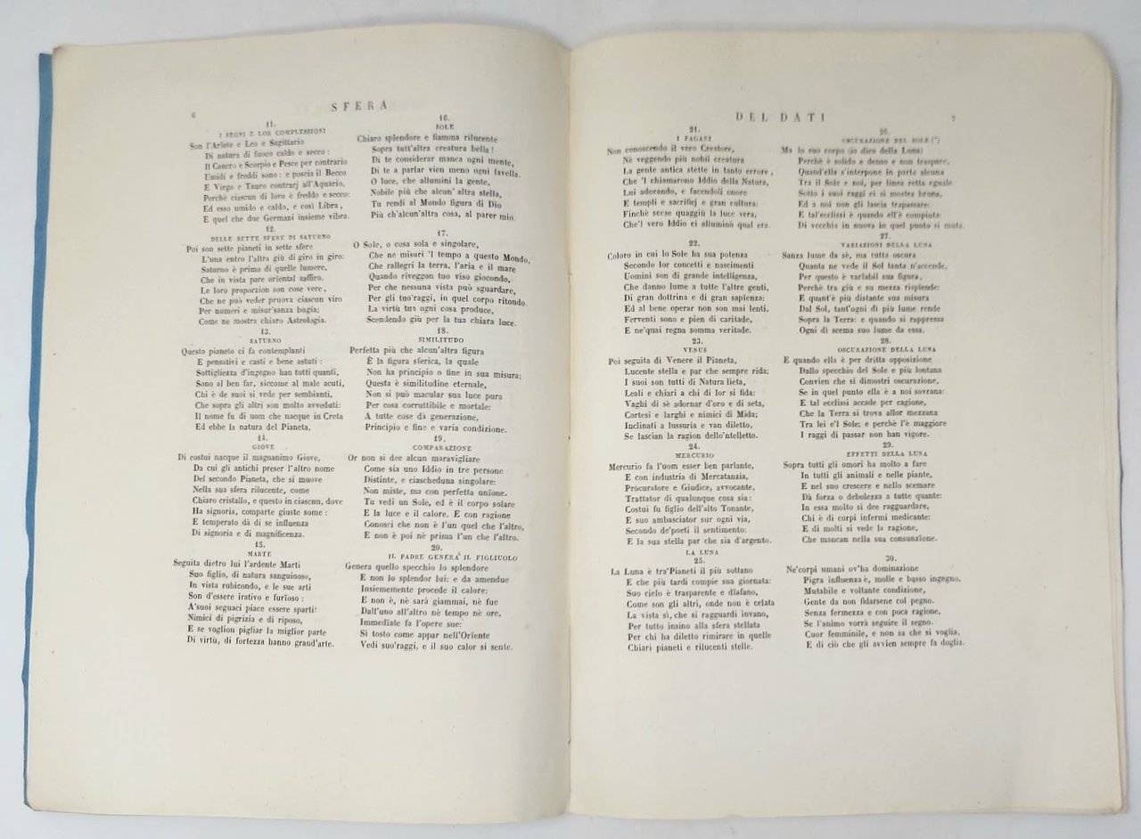 >In-4, pp. 28, testo su due colonne, brochure editoriale a stampa. Ottimo stato, esemplare con ampi margini. Interessante composizione poetica in cui si illustrano le conoscenze geografiche e astronomiche del XIV secolo. Testo di lingua allegato nel Vocabolario della Crusca. "Ora coi due libri prima aggiuntivi da F. Giovanni Tolosani da Colle sulla unica rarissima edizione di Firenze del MDXIV dati nuovamente in luce da Gustavo Cammillo Galletti". Esemplare perfetto, nella sua brossura originale.