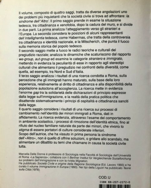 Soggetti: Sociologia, Antropologia Sociale e culturale, Scienze sociali, Problemi e ricerche sociali, Europa, Società multietnica, Est, Ovest, Cittadinanza, Immigrazione, Appartenenza, Integrazione, Accoglienza, Cultura, Mitscherich, Xenofobia, Conflitti sociali, Solidarietà, Tedeschi, Habermas, Razzismo, Tolleranza, Disuguaglianza, Diritti, Diritto, Identità, Discriminazione, Pregiudizio razziale, Differenza, We-Group, Out-group, Italia, Germania, DDR, Minori, Famiglia, Istituzioni, Identità etnica, Multiculturalismo, Scuola, Tradizioni culturali, Lingua, Istruzione, Nazione, Storia, Ideologia, Stranieri, Saggi, Bibliografia, Libri fuori catalogo, Attualità, Politica, Sociology, Social and cultural anthropology, Social sciences, Social problems and research, Europe, Multiethnic society, East, West, Citizenship, Immigration, Belonging, Integration, Hospitality, Culture, Xenophobia, Social conflicts, Solidarity, Germans, Racism, Tolerance, Inequality , Rights, Law, Identity, Discrimination, Racial Prejudice, Difference, Italy, Germany, Minors, Family, Institutions, Ethnic Identity, Multiculturalism, School, Cultural Traditions, Language, Education, Nation, History, Ideology, Foreigners, Essays, Bibliography, Out of print books, News, Politics