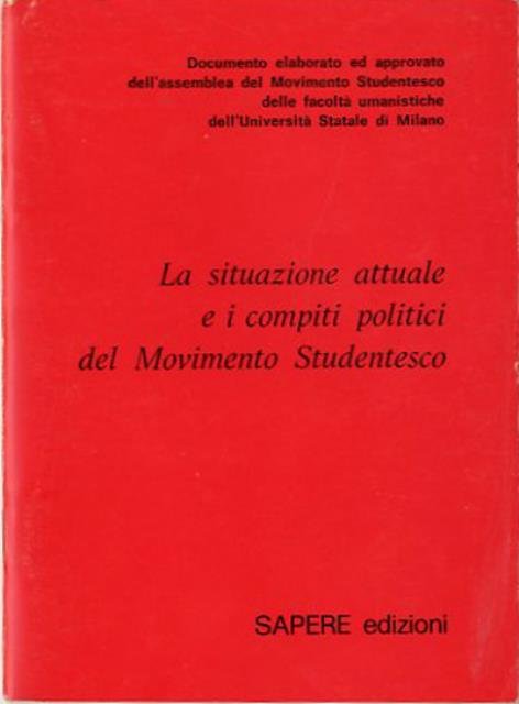 42 p. ; 16 x 12 cm. Documento elaborato ed approvato dall'assemblea del Movimento Studentesco delle facoltà umanistiche dell'Università Statale di Milano (18 dicembre 1969). Brossura editoriale, coperta in cartoncino flessibile plastificato opaco e colorato (rosso). Codice libreria 2064.