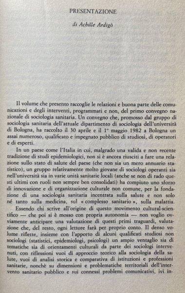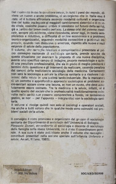 Il volume, che raccoglie relazioni e comunicazioni presentate al primo convegno nazionale di sociologia sanitaria, prende spunto da questa situazione per avanzare la proposta di una nuova disciplina, avente uno specifico campo di indagine, proprie metodologie e quindi una peculiare professionalità, che sia in grado di meglio precisare i termini della questione e gli interventi da realizzare, uscendo peraltro dai canoni della tradizionale sociologia della medicina. Certamente non sarà la sociologia a salvare la riforma sanitaria o a risolvere i di lemmi della salute in una società tardo-industriale. Ma la mancanza di un corretto e approfondito approccio sociologico ai problemi sociosanitari appare come una lacuna, se non un vuoto, che deve assolutamente essere colmato.