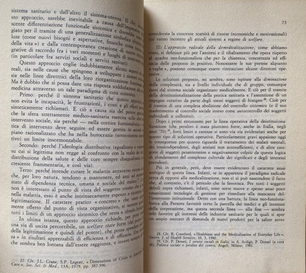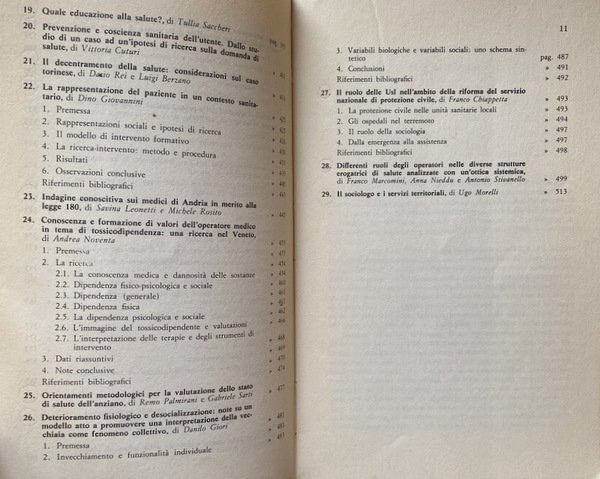 Soggetti: Manuali, Analisi sociologica, Critica, Salute, Sociologia sanitaria, Servizio Sanitario Nazionale (SSN), Tutela, Medicina Legale, Incidenza, Lesioni, Ferite, Malattie, Medicina Preventiva, Prevenzione pubblica, Società, Medicina del lavoro, Complessità sociale, Conference publication, Sociologie, Italie, Congressi, Seminari, Papers, Atti di convegni, Sociologie de la santé, Health services, Biosocial aspects, Proceedings, Assistenza sanitaria, Bologna, Medicina sociale, Epidemiologia, Psicologia, Statistica, Ospedali, Infermieri, Farmacologia, Farmaci, Cure, Terapie, Formazione, Teoria, Bibliografia, Riferimento, Consultazione, Teorie, Filosofia, Approccio, Marxismo, Funzionalismo, Fenomenologia, Welfare, Anni Ottanta, Dibattiti, Divulgazione scientifica, Burocrazia, Stato, Organizzazione, Territorio, Consumo, Informazione, Educazione, Cultura di massa, Consumismo, Class action, Storia, Legislazione, Responsabilità, Incidenti, Errori medici, Politica sociale, Mercato, Aziende farmaceutiche, Multinazionali, Stati Uniti, Assicurazione medica, Assicurazioni sociali, Germania, Sistemi sanitari occidentali europei e americano, Medici, Mutualità, Handicap, Disabilità, Famiglia, Contesto, Popolazione, Incidenza, Indicatori, Metodologia, Competenze, Mortalità, Morbosità, Virus, Epidemie, Antibiotici, Invalidità, Informatori sanitari, Operatori, Stile di vita, Integrazione, Ricerca, Università, Regioni, Decentramento, Pazienti, Relazione medico-paziente, Legge 180, Diritti, Donne, Aborto, Esempi, Andria, Torino, Casi, Veneto, Tossicodipendenza, Eroina, Cocaina, Barbiturici, Metadone, Antidepressivi, Ansiolitici, Sostanze stupefacenti, Alcolismo, Dipendenze, Anziani, Terza età, Invecchiamento, Vecchiaia, Demenza senile, Alzheimer, RSA, Accoglienza, Strutture, Professionalità, Libri Vintage Fuori catalogo, Studio, ASL, USL, Modelli di intervento, Esami, Demedicalizzazione, Ivan Illich, Noam Chomsky, Durkheim, Talcott Parsons, Scuola di Chicago, Pensiero sociologico, Blume, James Chadwick, Comte, Spencer, Marx, Foucault, Donzeolt, Dalmasso, Fornari, Manicomio, Basaglia, Engels, Le Play, Riforma sanitaria, J. Ehrenreich, Alienazione, Emarginazione, Malati, Distorsione, Bias, Conoscenza, Questionari, Pronto soccorso, Emergenza, Problematiche, Comunicazione, Natalità, Morte, Manuals, Sociological Analysis, Criticism, Health, Health Sociology, Italian National Health Service, Protection, Forensic Medicine, Incidence, Injuries, Wounds, Diseases, Preventive Medicine, Public Prevention, Society, Occupational Medicine, Social Complexity, Conference publication, Sociologies, Italy, Congresses, Seminars, Conference proceedings, Healthcare, Social medicine, Epidemiology, Psychology, Statistics, Hospitals, Nurses, Pharmacology, Drugs, Treatments, Therapies, Training, Theory, Bibliography, Reference, Consultation, Theories, Philosophy, Approach, Marxism, Functionalism, Phenomenology, Eighties, Debates, Scientific dissemination, Bureaucracy, State, Organization, Territory, Consumption, Information, Education, Mass culture, Consumerism, Class action, History, Legislation, Responsibility, Accidents, Medical errors, Social Policy, Market, Pharmaceutical Companies, Multinationals, United States, Medical Insurance, Social Insurance, Germany, Western European and American health systems, Doctors, Mutuality, Disability, Family, Context, Population, Incidence, Indicators, Methodology, Skills, Mortality, Morbidity, Viruses, Epidemics, Antibiotics, Disability, Health informers, Operators, Lifestyle, Integration, Research, Universities, Regions, Decentralization, Patients, Doctor-patient relationship, Law, Rights, Women, Abortion, Examples, Cases, Drug addiction, Heroin, Cocaine, Barbiturates, Methadone, Antidepressants, Anxiolytics, Drugs, Alcoholism, Addictions, Elderly, Third age, Aging, Old age, Senile dementia, Reception, Structures, Professionalism, Out of print books, Study, Intervention models, Exams, Demedicalization, School, Sociological thinking, Health reform, Alienation, Marginalization, Sick, Distortion, Knowledge, Questionnaires, First Aid, Emergency, Problems, Communication, Birth Rate, Death