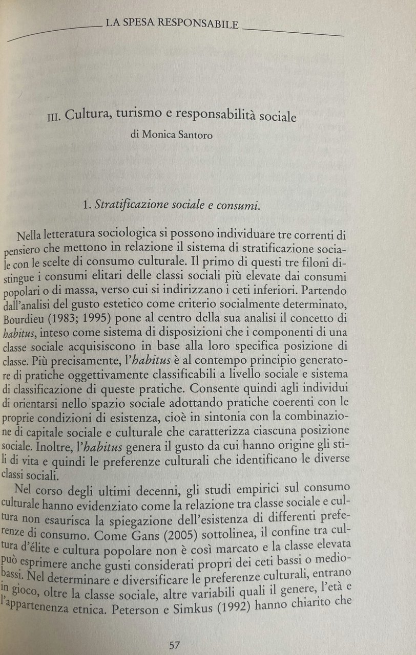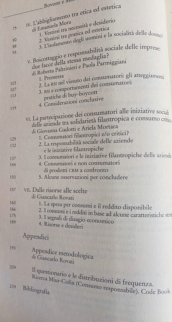 Soggetti: Scienze sociali Sociologia Ricerche Indagini Economia Consumismo Consumatori Prodotti bio Consumo responsabile Tutela Ambiente Ecologia Capitalismo Boicottaggio Etichette Informazione Coscienza Verde Consumi Responsabilità Cura di sé Benessere Azione critica Consumatore consapevole Contesto Consumo critico Impegno Attivismo Attivisti Mode Commercio equo e solidale Operatori Catene Approvvigionamento Distribuzione Italia Analisi Conoscenza Capitale simbolico Pratiche culturali Politica Mobilitazione Relazionali Identità Cultura Turismo Mappa Stratificazione Flussi turistici Orientamento Propaganda Pubblicità Abbigliamento Etica Estetica Usato Vintage Vestiti Canali Reti Riuso Riciclo Manodopera Terziario Condizioni lavorative Lavoro sottopagato Vestirsi Necessità Desiderio Uomini Donne Socialità Imprese Rst Atteggiamenti Comportamenti Buy-boycott Partecipazione Iniziative campagne sociali Aziende Solidarietà filantropica CRM Confronti Scelte Spesa Reddito Risorse Disagio economico Redditi Appendici Metodo Questionario Frequenza Ricerca Miur-Cofin Code Book Bibliografia Riferimento Consultazione Saggistica Libri rari fuori catalogo Ecologia Tutela ambientale Sostenibilità Controllo intelligente Produzione Sfruttamento Salario Mercato Studi culturali Tessuti Globalizzazione Merce Schiavitù Operai Comportamento Multinazionali Terziarizzazione Terzo Mondo CRM Filantropia Povertà Risparmio Agire sociale Desideri Marketing Social Sciences Sociology Research Surveys Economy Consumerism Consumers Organic products Responsible consumption Environmental protection Ecology Capitalism Boycott Labels Information Green Consciousness Consumption Responsibility Self-care Well-being Critical action Conscious consumer Context Critical Commitment Activism Activists Fashion Fair trade Operators Chains Procurement Distribution Italy Analysis Knowledge Symbolic capital Cultural practices Politics Mobilization Relational Identity Culture Tourism Map Stratification Tourist flows Orientation Advertising Clothing Ethics Aesthetics Used Clothes Channels Networks Reuse Recycling Labor Tertiary Working conditions Underpaid work Getting dressed Necessity Desire Men Women Sociality Businesses Attitudes Behaviors Participation Initiatives Social campaigns Companies Philanthropic solidarity Comparisons Choices Expenditure Income Resources Economic hardship Income Appendices Method Questionnaire Frequency Research Bibliography Reference Consultation Essays Rare books out of print Ecology Environmental protection Sustainability Intelligent control Production Exploitation Wage Market Cultural studies Fabrics Globalization Goods Slavery Workers Behavior Multinationals Outsourcing Third World Philanthropy Poverty Savings Action Desires Bourdieu Habitus Diritti sociali