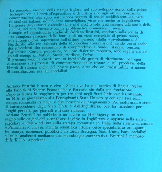 L'ampio ed approfondito studio di Adriano Bruttini, condotto sulla scorta di una completa rassegna delle fonti e di un ricco materiale di prima mano, pur incentrandosi soprattutto sull'ultimo periodo (dalla «rivoluzione» di Northcliffe alle tre inchieste della Monopolies Commission), rende conto anche dei precedenti che consentono di comprenderlo a fondo: stampa, censura, Parlamento, Corona, pubblicità, nel loro dialettico rapporto, sono seguiti sin dai grandi esempi di Milton, Steele, Addison, Defoe.
