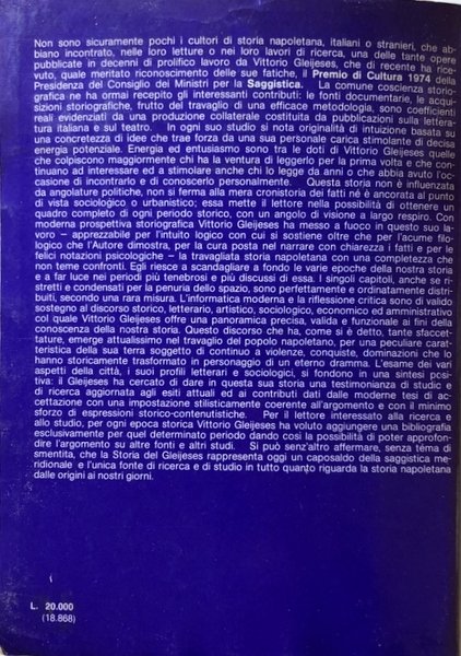 Soggetti: Storia locale, Genealogia, Regno, Cultura napoletana, Napoli, Campania, Reame, Storia moderna, Medievale, Contemporanea, Localistica, Classici, Arte, Architettura, Chiese, Società, Usi, Costumi, Popolazione, Dialetto napoletano, Nobiltà, Plebe, Aristocrazia, Masaniello, Rivolte, Rivoluzione partenopea, Repubblica, Borboni, Federico II, Intellettuali, Strade, Palazzi, Monumenti, Opere,Angioini, Aragonesi, Normanni, Neapolis, Napoli greco-romana, Decumani, Tribunali, Vesuvio, Martiri, Giacobini, Resistenza, Quattro giornate, Personaggi illustri, Famiglie napoletane, Matrimoni, Reali, Bibliografia, Ducato autonomo, Regno svevo, Durazzo, Viceregno, Gioacchino Murat, Regno Borbonico, Francesco II, Due Sicilie, Ferdinando II, Svevia, Posillipo, Mergellina, Pizzofalcone, Collina, Vomero, Centro storico, Municipio, Duomo, Spaccanapoli, Origini, Pre-ellenica, Cuma, Partenope, Sirene, Miti, Agorà, Porto, Sebeto, Commercio, Atene, Chiostro di Santa Chiara, Monastero, Certosa di San Martino, Largo del Mercatello, Piazza Plebiscito, Piazza Dante, Largo di Palazzo, Maschere, Pulcinella, Porcellane, Capodimonte, Feste, Piedigrotta, Tradizioni culturali, Calabritto, Carafa, Cordova, Quartieri Spagnoli, Pedro de Toledo, Risanamento, Ottocento, Pittura Napoletana, Seicento, Settecento, Caravaggio, Carmine, Epoche, Saggistica, Studi culturali, Libri Vintage, Fuori catalogo, Illustrati, Barocco, Roccoco, Peste, Bonaparte, Pompei, Ercolano, Eruzioni, Fascismo, Pausylipon, Virgilio, Lucullo, Tiberio, Impero romano, Capri, Ischia, Procida, Isole, Ville, Nerone, Claudio, Palepolis, Monte Echia, Battaglia di Benevento, Diomede Carafa, Porta Capuana, Quarteras, Salvator Rosa, Chiaia, San Gennaro, Battistello Caracciolo, Sanfelice, Monitore Napoletano, Eleonora Pimentel Fonseca, Teatro, Totò, Giambattista Vico, Benedetto Croce, Fabrizio Ruffo, Lazzari, Sanfedisti, Nicola Amore, corso Umberto I, Giovanni Bovio, Camorra, Bombardamenti, Campi Flegrei, Local history, Genealogy, Kingdom, Neapolitan culture, Naples, Realm, Modern history, Medieval, Contemporary, Classics, Architecture, Churches, Society, Uses, Costumes, Population, Neapolitan dialect, Nobility, Plebs, Aristocracy, Neapolitan Revolution, Republic, Bourbons, Frederick II, Intellectuals, Streets, Palaces, Monuments, Works, Angevins, Aragonese, Normans, Plague, Greco-Roman Cities, Decumans, Courts, Vesuvius, Martyrs, Jacobins, Resistance, Famous People, Neapolitan Families, Weddings, Royals, Bibliography, Autonomous Duchy, Swabian Kingdom, Durres, Vicereign, Bourbon Kingdom, Francis II, Two Sicilies, Ferdinand II, Swabia, Hill, Historical Center, Pre-Hellenic, Sirens, Myths, Port, Commerce, Athens, Monastery, Masks, Porcelain, Cultural Traditions, Spanish Quarters, Restoration, Nineteenth Century, Neapolitan Painting, Seventeenth Century, Eighteenth Century, Non-fiction, Cultural Studies, Books Out of print, Illustrated, Pompeii, Herculaneum, Eruptions, Virgil, Lucullus, Tiberius, Roman Empire, Islands, Villas, Theater, Bombardments
