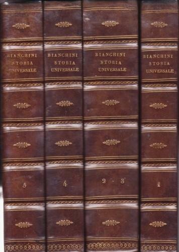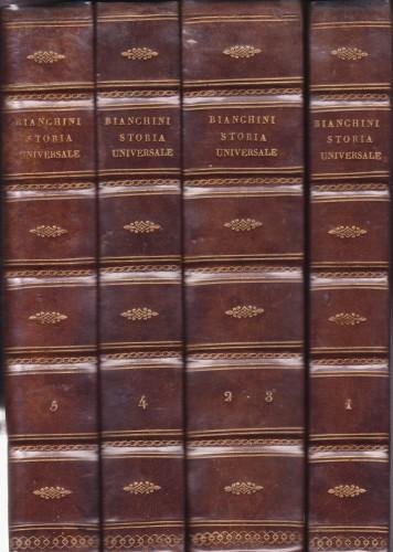 in 8 (cm 23x16,5), pp. XXXIX, 276; 191, 315; 320; 221, 102, 2 b., 68 nn. di indici, 77 tavv. f.t.; leg. coeva m/pelle molto ben conservata, ds. a nervi con tit. e fregi in oro, piatti in legno foderati di carta marmor. L'opera è ill. da 76 inc. f.t., (indicate con numeri romani quelle disegnate dal Bianchini e realizzate da A. Zuliani, indicate con numeri arabi quelle disegnate da Rizzardini e realizzate da A. Viviani), più 1 ritratto dell'A., 1 carta geogr. e 7 tav. geneal. e cronol. piu' volte ripiegate. Dedica a Giovambatista da Persico, Cavaliere della Legion d'Onore. Uomo di grande erudizione, versato nella storia e nell'astronomia, l'A. fu Sovrintendente delle antichit romane, bibliotecario del Cardinal Ottoboni e cameriere d'onore di Clemente XI. L'opera contiene nelle pp. a numeraz. romana del 1 vol., la "Vita di M. F. Bianchini scritta da Pier-Alessandro Paravia"; nel 5 vol. la "Introduzione disposizione e compendio di tutta l'opera" e, nelle pp. nn., la "Compendiosa tavola cronologica delle principali epoche di politica, guerra, scienze ed arti, dall'et di Ciro ai nostri giorni", l'"Elenco delle opere stampate e inedite di Mons. Fr. Bianchini". Brunet I, 847: "Quest'opera si arresta alla distruzione degli Assiri, nondimeno ricercata a causa delle incisioni che sono belle e curiose"; Gamba 1798: "Migliore d'ogni altra la edizione moderna di Venezia, Battaggia, 1825-28, vol. 5 in 8 gr. con figure. E' opera curiosa e importante per la storia e per l'antiquaria". Ottimo esemplare con solo lievi fior. 635/37