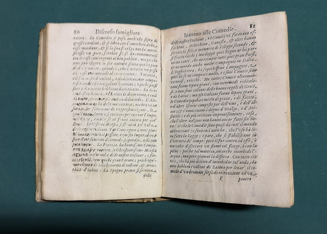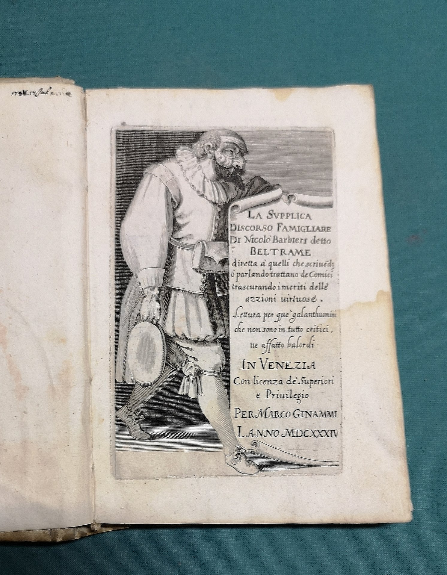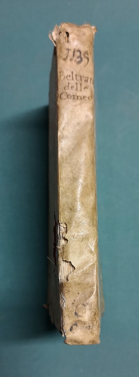 >in-8, pp. (16, compr. le prime 2 bianche), 233, (3), leg. coeva p. perg. molle, tit. ms. al dorso (piccola mancanza al piatt ant. e post.). Caratteristico stupendo frontespizio, inciso in rame, con un uomo in maschera in costume che sorregge una locandina su cui è scritto il titolo. Fregi ed iniz. silogr. Dedica dell'autore a "Lodovico il Giusto re di Francia, e di Navarra" (Luigi XIII). Seconda edizione (la prima, senza le parole "La supplica" nel titolo come la presente, era apparsa a Ferrara nel 1628) Rara, importante e curiosisima opera polemica in difesa della professione dei comici e della commedia. In fine (pp. 216-233) vi è ristampato il breve "Trattato sopra l'arte comica", già apparso a Genova nel 1627. Come nota il Sanesi (II, p. 49), alcuni tra i più noti comici del XVII secolo, oltre il Barbieri (P.M. Cecchini, G.B. Andreini, F. Scala, G.P. Fabri, L. Riccoboni), furono costretti a pubblicare delle opere polemiche per difendersi dai durissimi attacchi di molti teologi e moralisti che, in contrasto con l'atteggiamento benevolo di una parte del clero, "proseguendo la tradizione cattolica medievale, combattevano tenacemente il teatro e scagliavano contro l'arte corrotta e corrompitrice dei comici le accuse più veementi". L'intenzione particolare di questa "supplica" al suo protettore Luigi XIII, da cui aveva ricevuto grandi onori nel periodo trascorso a Parigi, fu quella di difendere la sua prima commedia, rappresentata e "storpiata" da tutte le compagnie teatrali, "L'Inavvertito, ovvero Scapino disturbato, e Mezzettino travagliato", apparsa a Torino nel 1629, più tardi imitata da Molière nello "Étourdi" (1653) ed ispiratrice di alcune scene dello "Amant indiscret" di Philippe Quinault (1654). Il Barbieri (Vercelli 1576 - Modena 1641), fu stimato ed affermato autore di teatro e comico di gran successo. « Niccolo Barbieri est un des plus célèbres Beltrame, si non le créateur du type. Il avait fait partie de la troupe des Gelosi, puis des Fedeli... Il a écrit un très curieux ouvrage, La Supplica... » (Duchartre, La Comédie italienne, 1924, p. 162). Buon esemplare, genuino (con lievissimi aloni d'umido). BMC, XVII SEC., P.73. MICHEL-MICHEL, I,