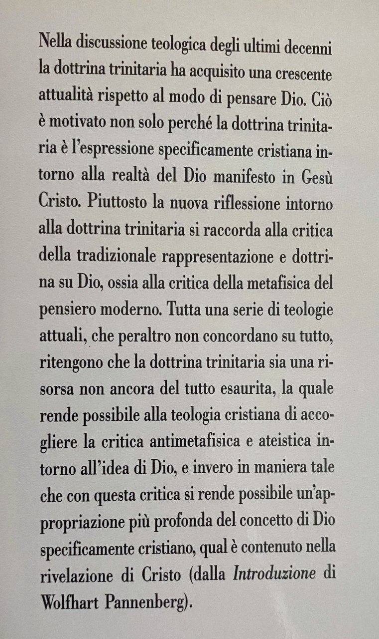 Nella discussione teologica degli ultimi decenni la dottrina trinitaria ha acquisito una crescente attualità rispetto al modo di pensare Dio. Ciò è motivato non solo perché la dottrina trinitaria è l'espressione specificamente cristiana intorno alla realtà del Dio manifesto in Gesù Cristo. Piuttosto la nuova riflessione intorno alla dottrina trinitaria si raccorda alla critica della tradizionale rappresentazione e dottrina su Dio, ossia alla critica della metafisica del pensiero moderno. Tutta una serie di teologie attuali, che peraltro non concordano su tutto, ritengono che la dottrina trinitaria sia una risorsa non ancora del tutto esaurita, la quale rende possibile alla teologia cristiana di accogliere la critica antimetafisica e ateistica intorno all'idea di Dio, e invero in maniera tale che con questa critica si rende possibile un'appropriazione più profonda del concetto di Dio specificamente cristiano, qual è contenuto nella rivelazione di Cristo (dalla Introduzione di Wolfhart Pannenberg).