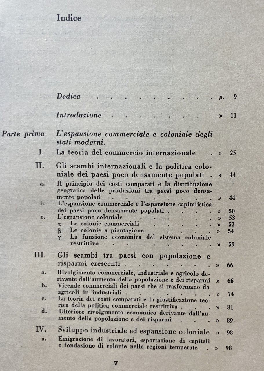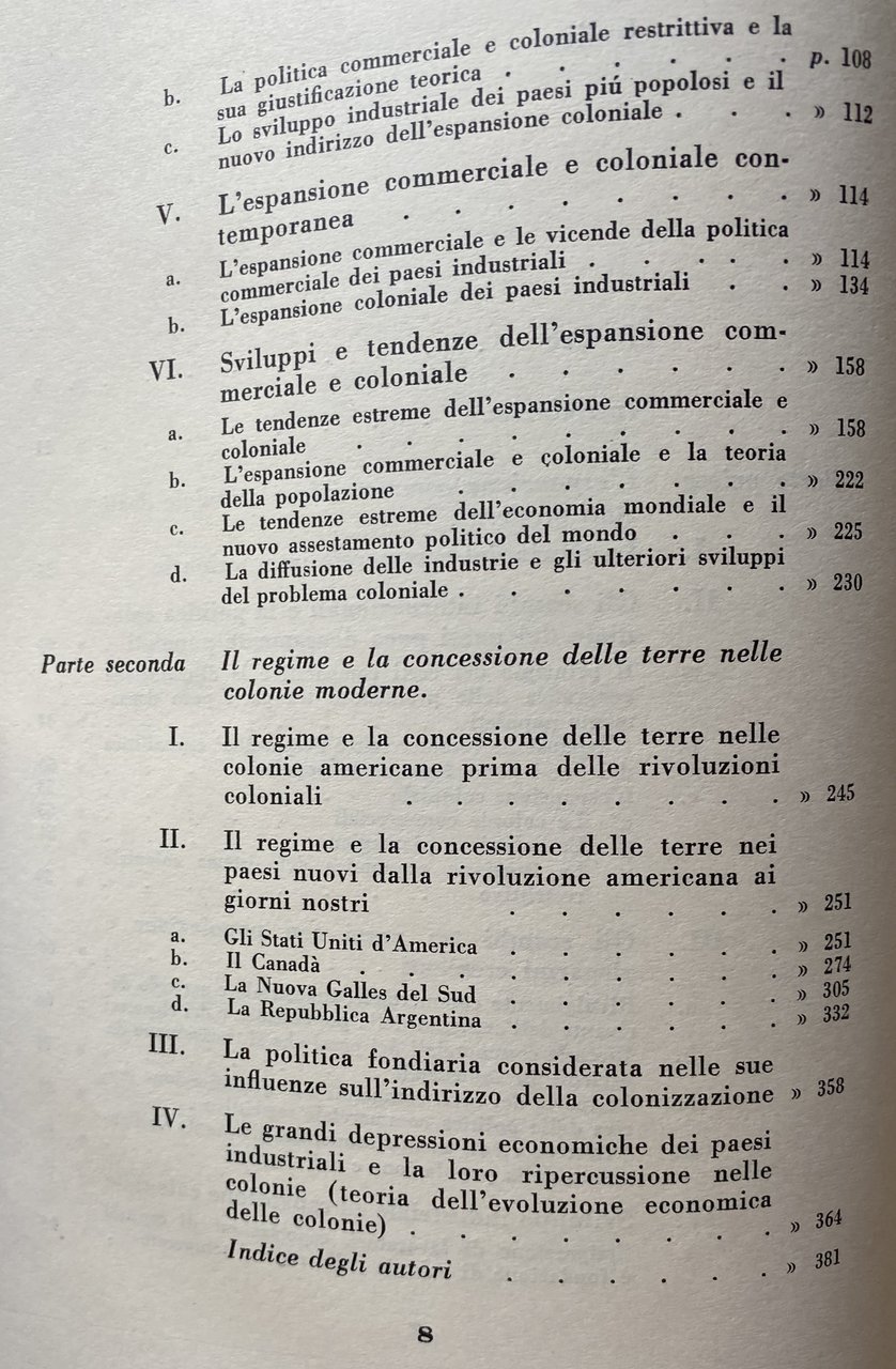 Soggetti: Studi coloniali Economia coloniale Imperialismo Imperi Colonialismo Colonizzazione Sfruttamento Potenze Commercio Espansione commerciale Stati moderni Documenti Barone Storia economica contemporanea Storiografia Mérignhac Précis de législation économie coloniale Dechesne Mazzei Politica economica internazionale inglese Adam Smith Antonio de Mantero Velarde Portoghese Mondaini Cabrini Lavoro Società delle Nazioni Casali Dominions britannici Conferenze imperiali Africa Wolf Casciani Problemi Doganale Dazi Tasse Esportazioni Dopoguerra Italia Colonie Madrepatria Regime Corporativo Protezionismo Legislazione fondiaria Teorie economiche Costi comparati Teoria Scambi internazionali Demografia Popolazione Distribuzione geografica Produzioni Densamente popolati Capitalismo Piantagioni Sistema restrittivo Risparmio Industria Agricoltura Aumento Sviluppo industriale Emigrazione Lavoratori Capitali Fondazione Regioni temperate Clima Giustificazione teorica Popolosi Concessione Terre Territori Coltivazioni Materie prime Americane Rivoluzioni Rivolte Rivoluzione americana Stati Uniti Canada Nuova Galles Sud Argentina Fondiaria Grandi depressioni economiche Evoluzione Stuart Mill Ricardo Mill James Anni Cinquanta Collezionismo rarità Libri rari fuori catalogo Bibliografia Letteratura Riferimento Saggistica Acri Australia britannica British Buenos Aires Coltivazioni Estero Concessioni Condizioni Cotone Inghilterra Demografica Divario Prezzi Journal Economist Rios Esportazioni Frumento Pezze Galles Giappone Homesteads Immigranti Importazioni Juta Libero-scambio Londra Manitoba Manufatti Mercati Mercato Mondiale Ontario Ottawa Paesi industriali Lana Prodotti agricoli Proprietari Province Québec Secolo XIX XVIII States Teoria Vendite Zone climatiche Atti di Navigazione Cereali Capo Coltura Concorrenza Crisi Dazi Divisione Doganale Francia Germania Lavoro Gran Bretagna Incremento Produttività Manifatture Marina mercantile Metropoli Monopolio Marginale Progressi Quintali Russia Stranieri Supremazia Tariffe Trasformazione Valore internazionale Oro Moneta Viveri Wakefield Zollverein Allen Bancroft Bernoulli Bentley Bismarck Buchanan Chamberlain Coghlan Cournot Cunningham De La Fuente Epps Gini Godio Leroy-Beaulieu Ishii Ryoichi Knowles Kautsky Keynes Kropotkin Engels Kondratieff Lenin Malthus Marxismo Levasseur Lorini Luzzatto Marshall Fordismo Maffeo Pantaleoni Mosca Pareto Nitti Porter Ugo Rabbeno Penrose Rothschild Gerhart von Schulze-Gävernitz Shosuke Sidney Sraffa Taussig Thorp Taylor Torrens Vacher Yeats Wakefield Weeden Wiener Wythe Webb Zolla Walras Grafici Statistiche Dati Dominio Potere Coloni Macchine Tecniche Città Salario Salariati Rurali Ottocento Novecento Pastorizia Guerre Competizione Speculazioni Selectors Squatters Robertson Act Asta Acquisti Aste Frodi Corruzione Sindacati Diritti Credito Privati Dittatura Alienazioni Esproprio Pampa Indigeni Guerra civile Indonesia India Cina Burma Oltremare Concessione gratuita Free-soilers Famiglie Beni Poderi Rate Pagamenti Lotti Disoccupazione Impiego Cotoniera Consumo Dundee Scozia Indie Missione civilizzatrice Minerali Gas Acqua Petrolio Protettorati Possedimenti Commonwealth Sudafrica Ceylon Malaysia Nuova Zelanda Malta Gibilterra Guiana Kenya Maghreb Dipendenza Frantz Fanon Indigénat Schiavitù Tratta degli schiavi Sovranità Algeria Colonial studies Colonial economy Imperialism Empires Colonialism Colonization Exploitation Powers Trade Commercial expansion Modern states Documents Contemporary economic history Colonial historiography International economic policy English Portuguese Work League Nations British dominions Imperial conferences Problems Customs Duties Taxes Exports Post-war Italy Colonies Mother country Corporate regime Protectionism Land legislation Economic theories Comparative costs Theory International Demography Population Geographical distribution Production Densely populated Capitalism Plantations Restrictive system Savings Industry Agriculture Increase Industrial development Emigration Workers Capital Foundation Temperate regions Climate Theoretical justification Populous Concession Land Territories Cultivations Raw materials American Revolutions Revolts United States New South Wales Land Great economic depressions Evolution 1950s Collecting rarities Rare books out of print Bibliography Literature Reference Essays British acres Cultivations Foreign Concessions Conditions Cotton England Demographic Gap Prices Exports Wheat Pieces Japan Immigrants Imports Jute Free-trade London Manufactures Markets World Market Industrial Countries Wool Agricultural Products Owners Provinces 18th 19th Century Theory Sales Climatic Zones Navigation Acts Cereals Chief Crop Competition Crisis Duties Customs Division France Germany Work Great Britain Productivity Increase Manufactures Merchant Navy Metropolis Monopoly Marginal Progress Quintals Foreigners Supremacy Tariffs Transformation International Value Gold Currency Food Graphs Statistics Data Dominion Power Colonists Machines Techniques Cities Salary Rural Wage Workers 20th Century Pastoralism Wars Competition Speculation Auction Purchases Auctions Fraud Corruption Unions Rights Credit Private Dictatorship Alienations Expropriation Pampas Indigenous Revolution Civil War Indonesia China Overseas Concession Free-soilers Families Goods Farms Installments Payments Lots Unemployment Employment Cotton Mill Consumption Dundee Scotland Indies Civilizing Mission Minerals Water Oil Protectorates Possessions South New Zealand Gibraltar Guyana Dependency Slavery Slaves Sovereignty
