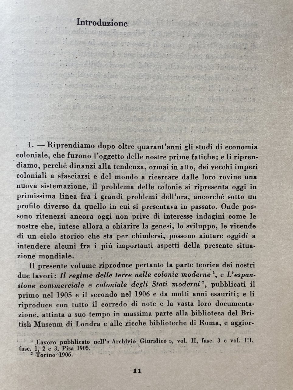 Il presente volume riproduce la parte teorica dei nostri due lavori: Il regime delle terre nelle colonie moderne, e L'espansione commerciale e coloniale degli Stati moderni, pubblicati nel 1905 e 1906 e da molti anni esauriti; e li riproduce con tutto il corredo di note e la vasta loro documentazione, attinta a suo tempo in massima parte alla biblioteca del British Museum di Londra e alle biblioteche di Roma, e aggiornata di recente. Dei due volumi il presente segue le grandi linee e ripresenta, solo con qualche modificazione e i necessari aggiornamenti, le conclusioni fondamentali, perché le teorie dell'espansione coloniale e della evoluzione economica delle colonie in essi esposte ci sono apparse nel complesso ancora valide e tali quindi da potere essere riesposte senza mutamenti radicali. E questo anche perché, se molto fu scritto da allora sui problemi economici delle colonie, ciò fu però fatto dai più, tranne forse che dal prof. Barone, prevalentemente con indirizzo storico o descrittivo, o con intenti polemici. Ma nessun tentativo di costruzione teorica su basi nuove fu effettuato né in Italia, né all'estero. Cosicché le teorie esposte nei due accennati lavori possono considerarsi non ancora superate da teorie più recenti. Il volume si divide in due parti. La prima si occupa dell'espansione coloniale degli Stati moderni ricollegandola al fattore economico-demografico e basandone lo studio sulla teoria dei costi comparati. La seconda si occupa delle leggi dell'evoluzione economica delle colonie e studia il problema fondiario di quattro fra i più importanti paesi nuovi: gli Stati Uniti, il Canadà, la Nuova Galles del Sud e l'Argentina. Data la diversa natura dei problemi trattati questa seconda parte può sembrare indipendente dalla prima. Ma nel fatto non lo è, perché negli ultimi capitoli nei quali si passa dalla analisi alla sintesi, onde dal diverso indirizzo della legislazione fondiaria e della colonizzazione dei diversi paesi desumere le leggi dell'evoluzione economica delle colonie, essa si richiama e ricollega a ritroso alle leggi dell'espansione coloniale. Cosicché l'idea madre che domina in tutta la prima parte e ne costituisce il motivo fondamentale, rappresenta altresì il filo conduttore della seconda; filo conduttore che nei primi capitoli di questa si sperde fra le minuzie di una lunga esposizione della politica fondiaria dei paesi nuovi, ma che riaffiora poi e ricompare nei capitoli conclusivi, nei quali l'espansione dei paesi colonizzatori e l'evoluzione economica delle colonie appariranno parti inscindibili e integranti di uno stesso processo evolutivo, e l'unità organica di questo si mostrerà in piena luce. Dei vari fattori che possono contribuire e nel corso dei secoli contribuirono all'espansione coloniale dei paesi europei (fattori politici, religiosi, militari) studiamo soltanto il fattore economico-demografico, anzitutto perché esso, nei tempi più recenti è stato senza dubbio il più importante, e in secondo luogo perché è il solo che a noi economisti competa di studiare.