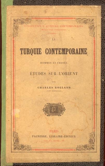 Prima edizione. Testo francese. Cm.22,7x14,3. Pg.(2), 426. Legatura in mz.tela con piatti originali applicati alla coperta. Esemplare in barbe. Memorie di un viaggio compiuto in Turchia dall'avvocato e politico Pierre- Charles- Antoine Rolland Mâcon (1818-1876). Codice libreria 130254.