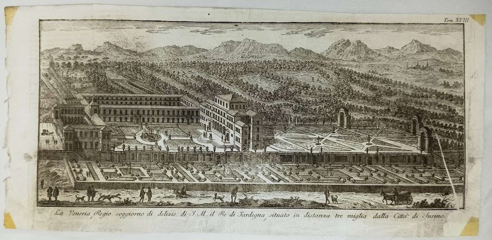 >Acquaforte originale (mm 170 x 370), con margini disuguali. Rara veduta prospettica del castello e del parco della Venaria, voluta da Carlo Emanuele II su disegno del conte Amedeo di Castellamonte. Dopo l'assedio del 1706 l'edificio fu restaurato da Juvarra e divenne residenza di caccia dei Savoia. Tavola, non firmata, ma tratta dalla raccolta di Thomas Salmon "Storia moderna di tutti i popoli del mondo", 1740-1756. Veduta animata da personaggi, sullo sfondo un'animata scena di caccia. Lungo il lato inferiore, il titolo. In alto a destra, indicazione della tavola n° XVIII. Esemplare in discreto stato di conservazione, restauro sull'angolo inferiore destro; tracce di antiche piegature. PEYROT A., "Torino nei secoli [...]", Torino 1965, vol. I, 175-6. Cfr. CREMONINI, L'Italia nelle Vedute e Carte Geografiche dal 1493 al 1894, 64